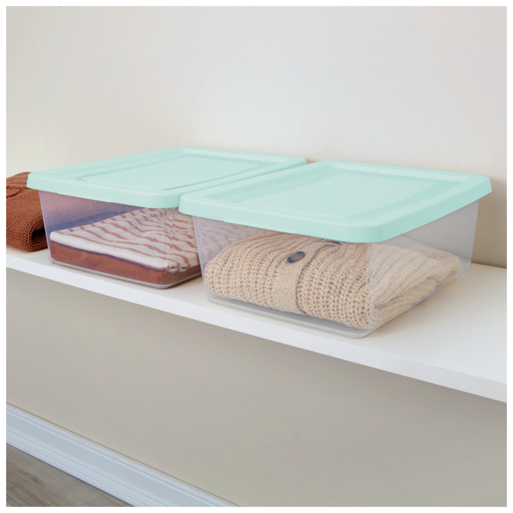 The clear base allows you to view contents at a glance, saving time when searching for stored items, while the opaque snap-on lid provides a clean, simple look and ensures contents stay contained and protected. Designed with recessed lids, these boxes securely stack with others of the same size, maximizing vertical space for efficient organization on shelves or in closets. Ideal for shoes, accessories, crafts, office supplies, clothing, or small household items, the compact design fits neatly on 16" wire closet shelving, making it especially useful for closet organization.