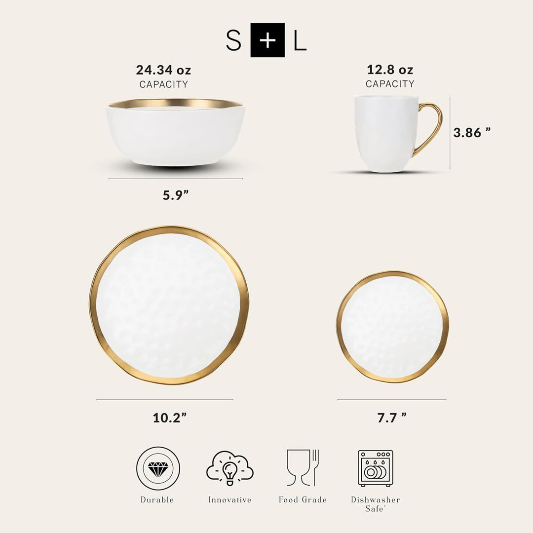 This complete dinnerware set includes 4 dinner plates, 4 salad plates, 4 bowls, and 4 mugs, providing a full service for four. Ideal for family dinners, intimate gatherings, or hosting guests, this set offers everything you need for a stylish and functional dining experience. Crafted from high-quality porcelain, each piece is designed to deliver lasting durability while exuding a refined, sophisticated charm. The modern gold border and organic edges contribute to its elegance, making it a standout addition to your table setting.
