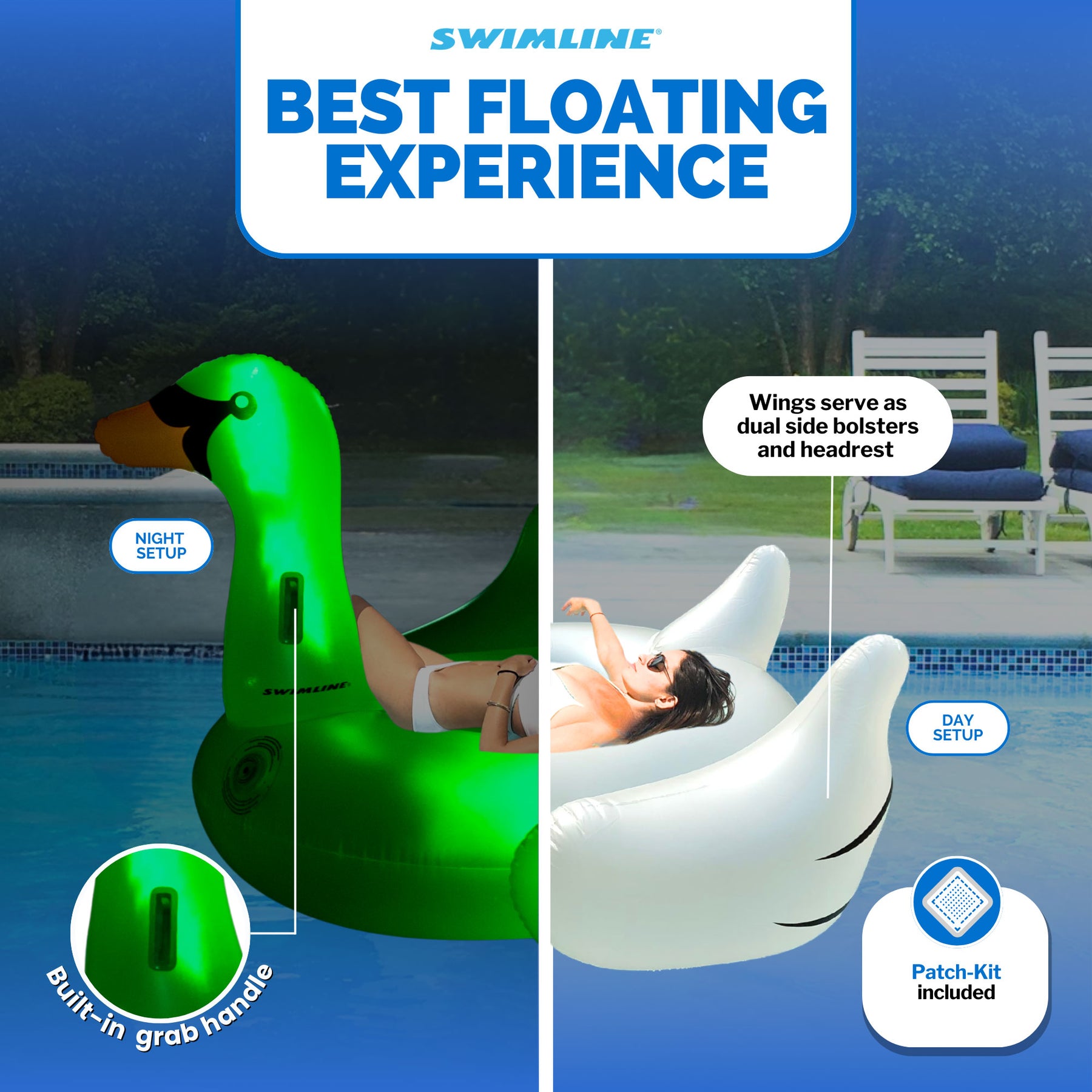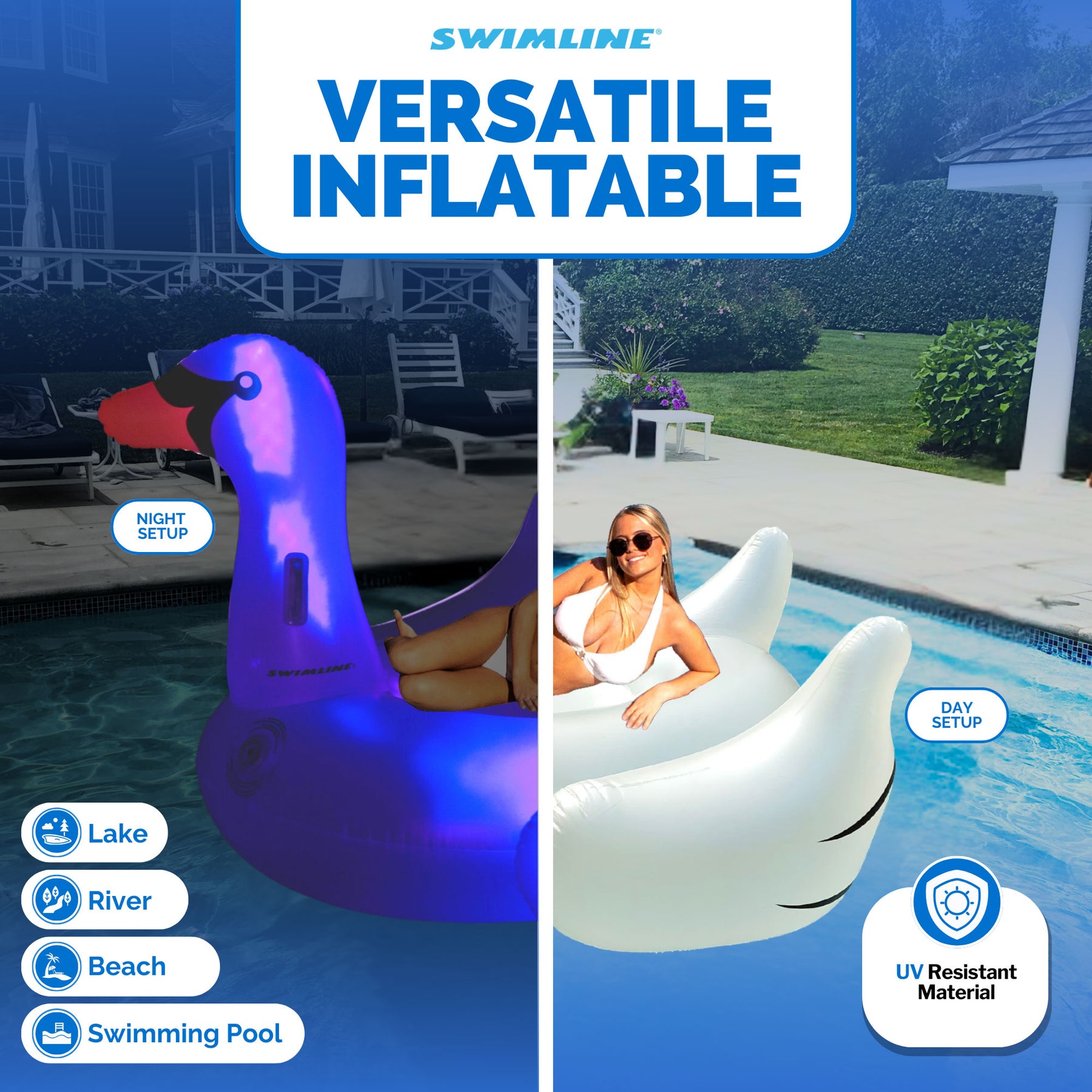 • Soar across the water in style on this Swimline Giant Inflatable LED Light-Up Ride-On Swan Float