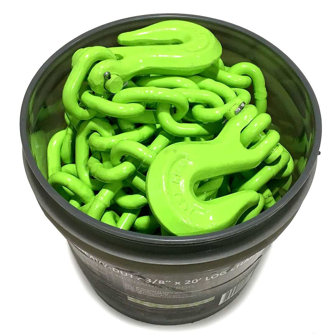 Holding up to 5,400 pounds, the chain is rugged enough to heave even massive logs of dense wood. Tow heavy timber like oak and hickory with ease by attaching the chain to your truck, ATV, tractor, or lawn tractor. Sporting a highly-visible bright green color, the chain pops out against nearly any background, meaning you can always locate the chain wherever you go. An included carry bucket allows for effortless transportation, letting you quickly set-up for log skidding anywhere. Durable, heavy-duty steel construction makes for an ultra-strong chain ready for any job. The grade 43 chain measures 20 feet long and each link has a 3/8-inch diameter, ensuring durability as you work.