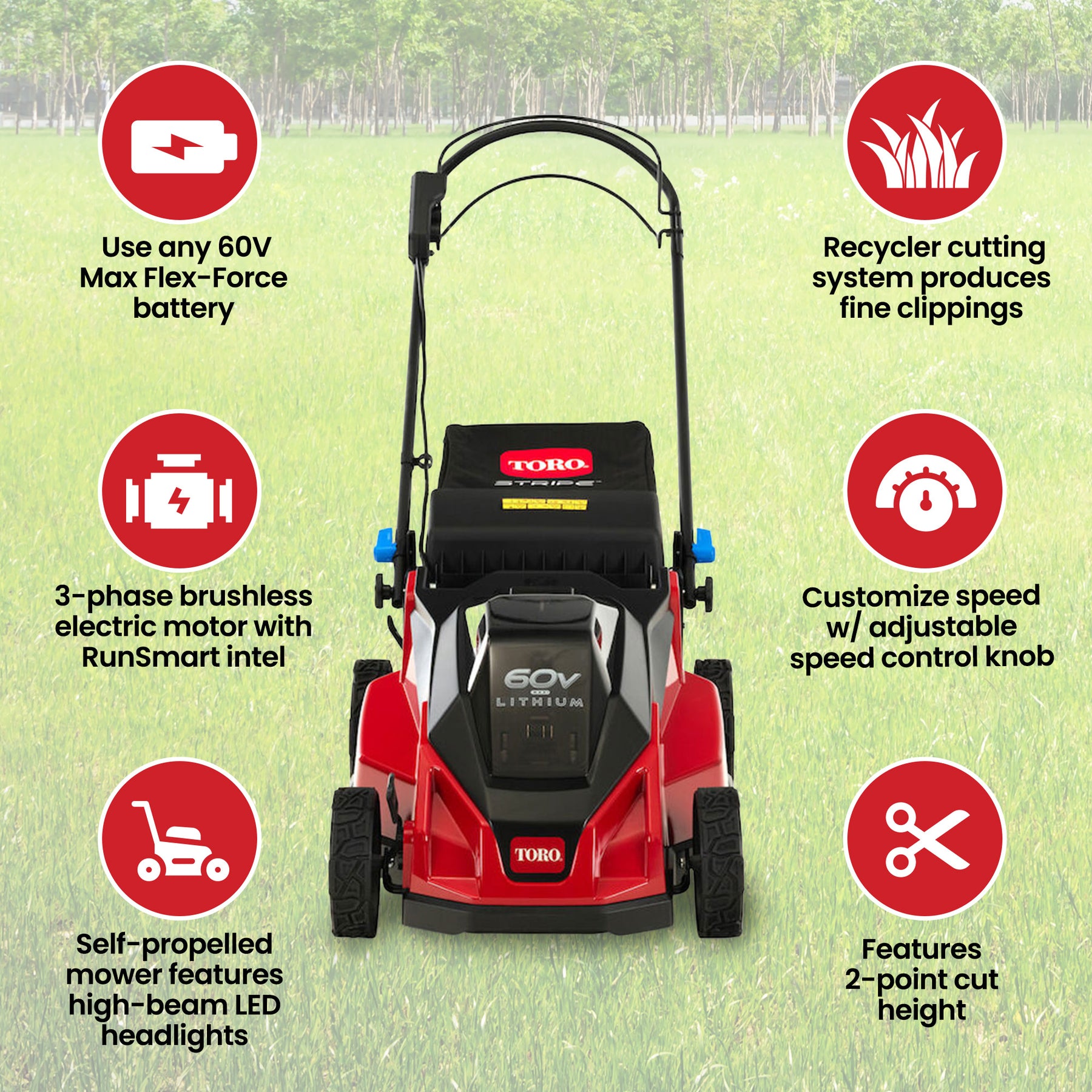 • Self-propelled mower features high-beam LED headlights so you can mow any time of day with up to 60 minutes of runtime; Includes battery and charger