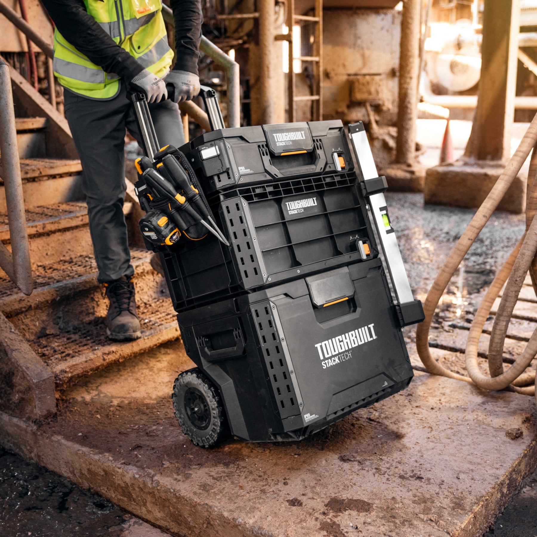 The StackTech Rolling Tool Box is the mobile foundation of the system. It features an intuitive self-aligning top that allows StackTech boxes and totes to virtually stack themselves on the Rolling Tool Box. Accessing tools is simple and intuitive with a one-handed center latch, standard to every size toolbox and organizer. Inside, you'll find an internal tray to help Pros stay organized and partition their space. The telescoping rear handle detaches rapidly to fit the StackTech Rolling Tool Box under the cover of your truck bed. Full customization is at Pros fingertips with tool-free, quick-release steel accessory rails. StackTech Rolling Tool Box is built for high-impact durability with armored corners, a steel-reinforced lid, and IP65 dust and water protection to ensure it can handle the toughest conditions. Dual locking points secure tools in the truck or on the jobsite, and robust 9-in all-terrain wheels tackle any environment on the go. The StackTech Rolling Tool Box forms the perfect cornerstone for Pros to build a system unlike any other and customize it to the needs of every trade.