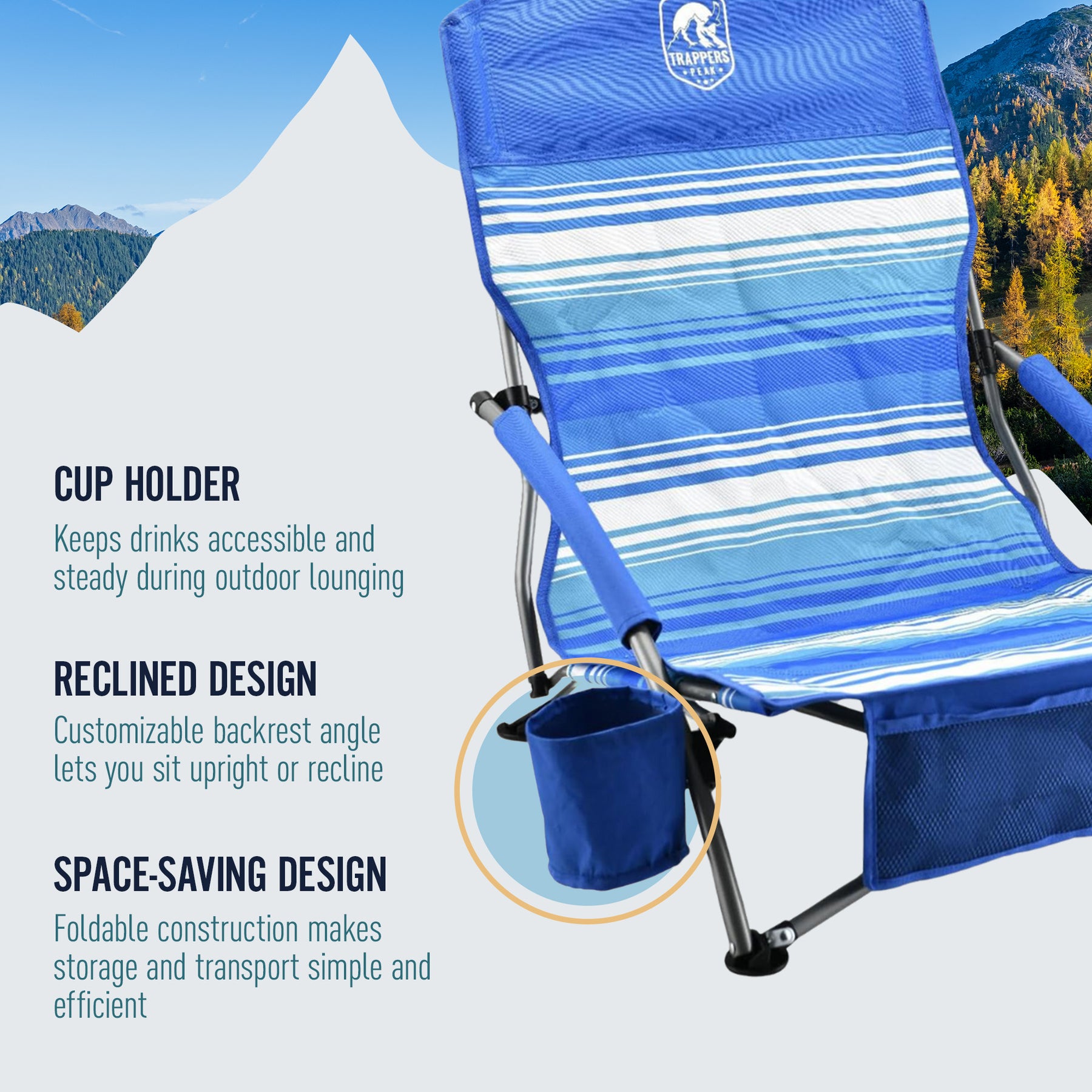 Trapper’s Peak 2 Pack Low Profile Folding Beach Chairs, Cup Holder, Bag, Blue
