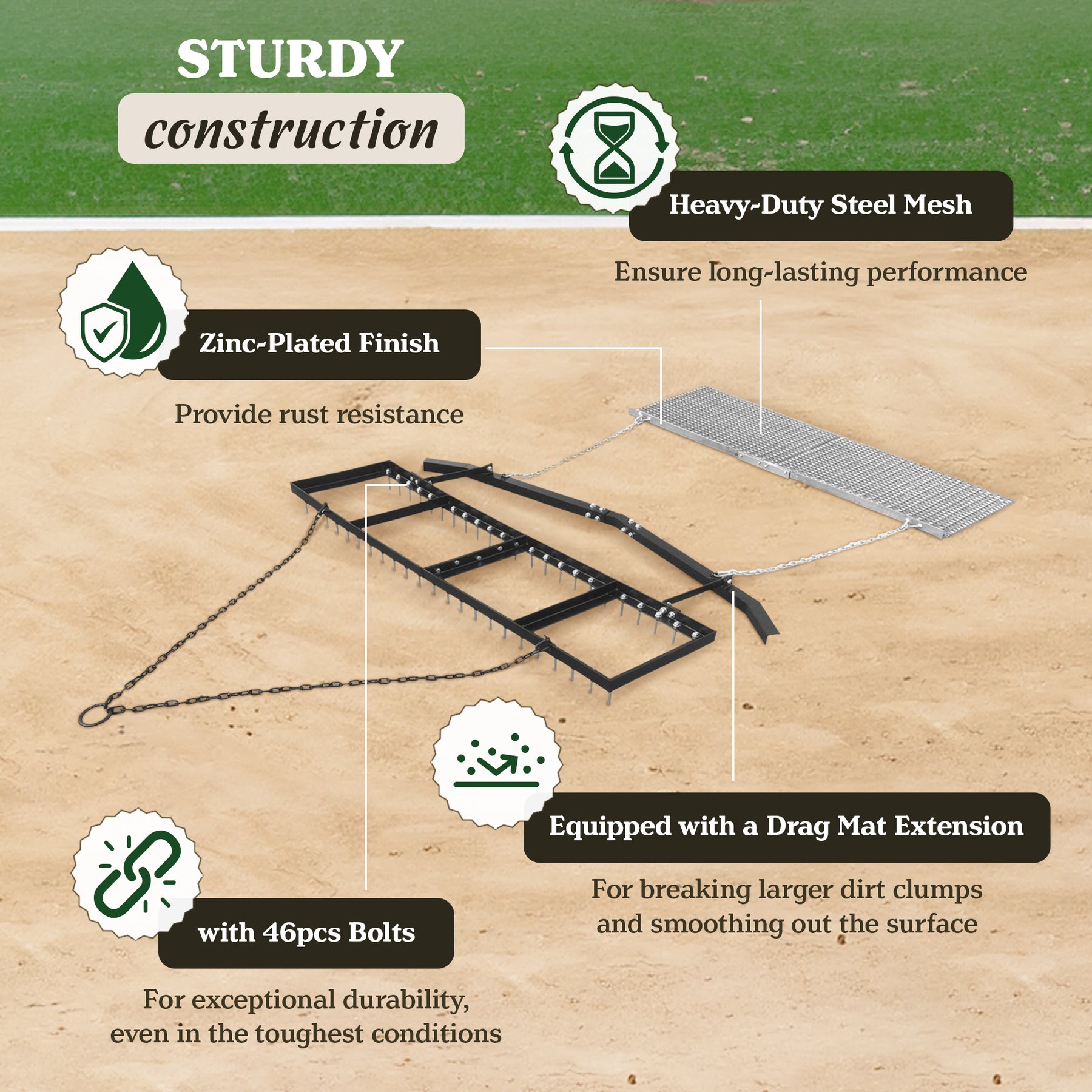 • Includes drag mat extension for breaking larger dirt clumps and smoothing out the surface