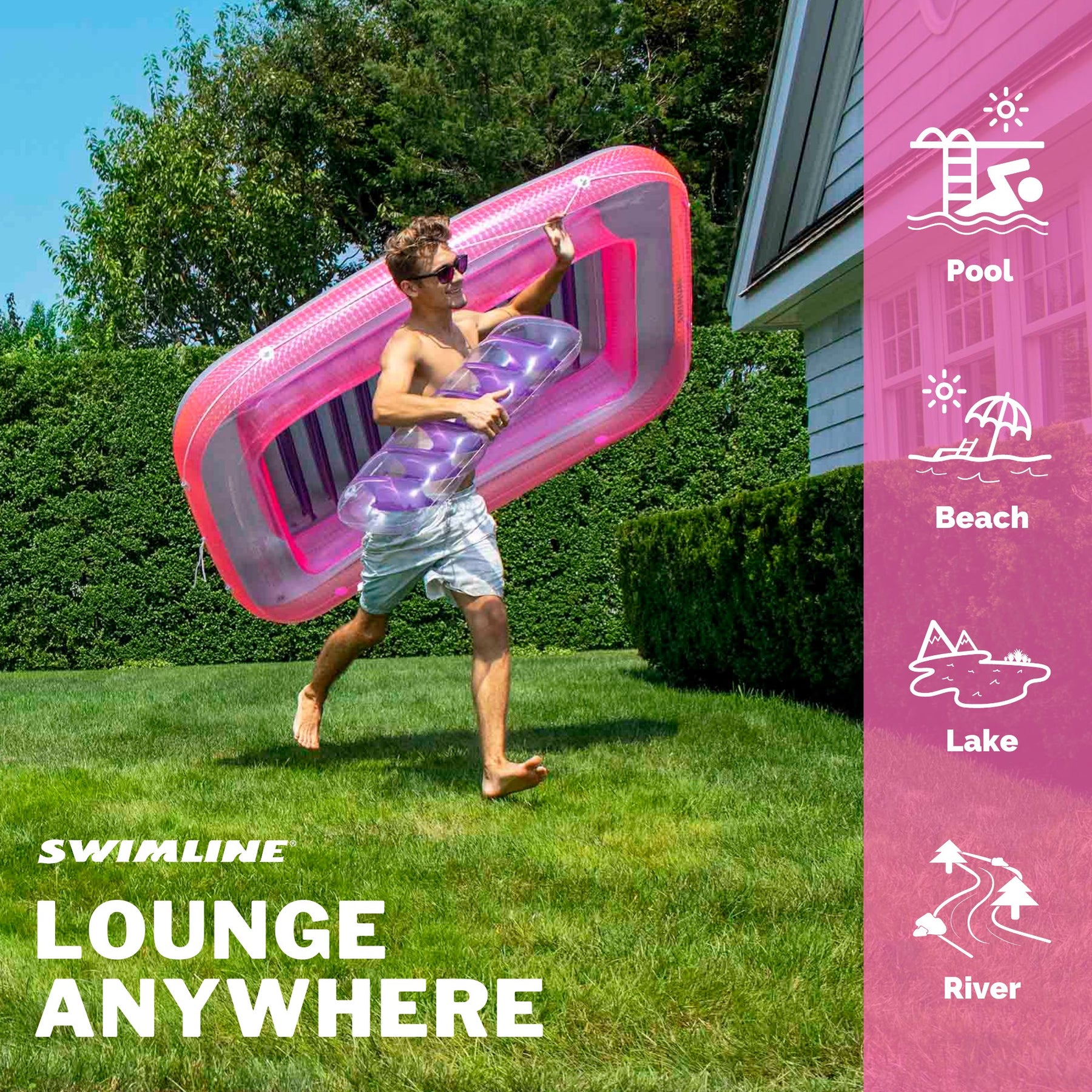• Inflatable reflective suntan lounge made of sturdy vinyl construction with grab rope and pillow