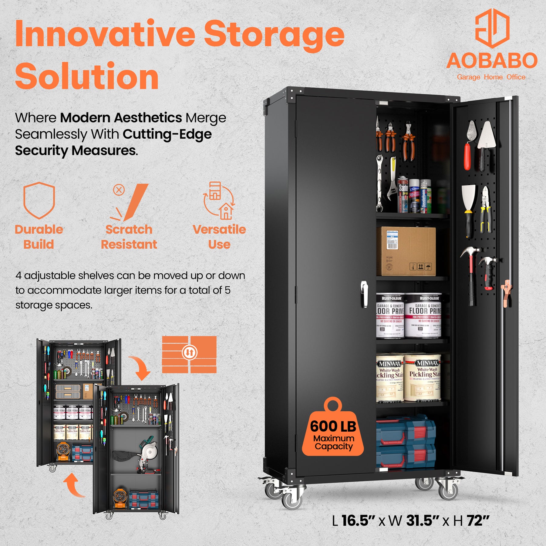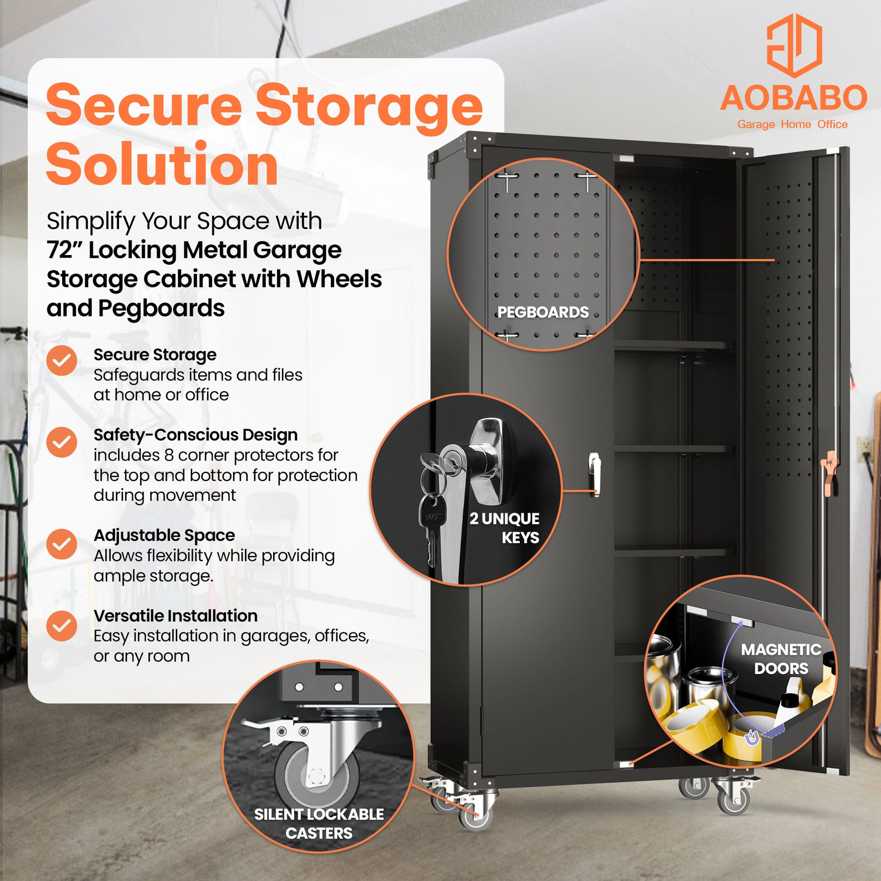 • Discover the advantages of this 72-inch metal storage cabinet by AOBABO, crafted with practical pegboards, featuring an adjustable board and additional pegboards on the doors, streamlining the process of organizing tools effortlessly