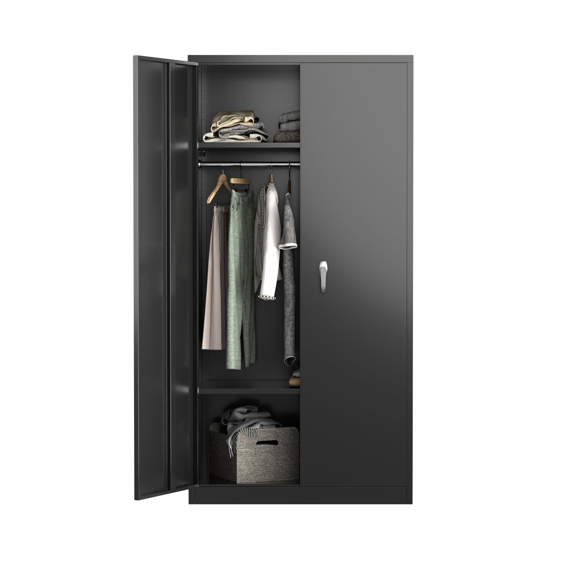 AOBABO Large Metal Storage Cabinet w/Adjustable Shelf & Cloth Rail, Black (Used)