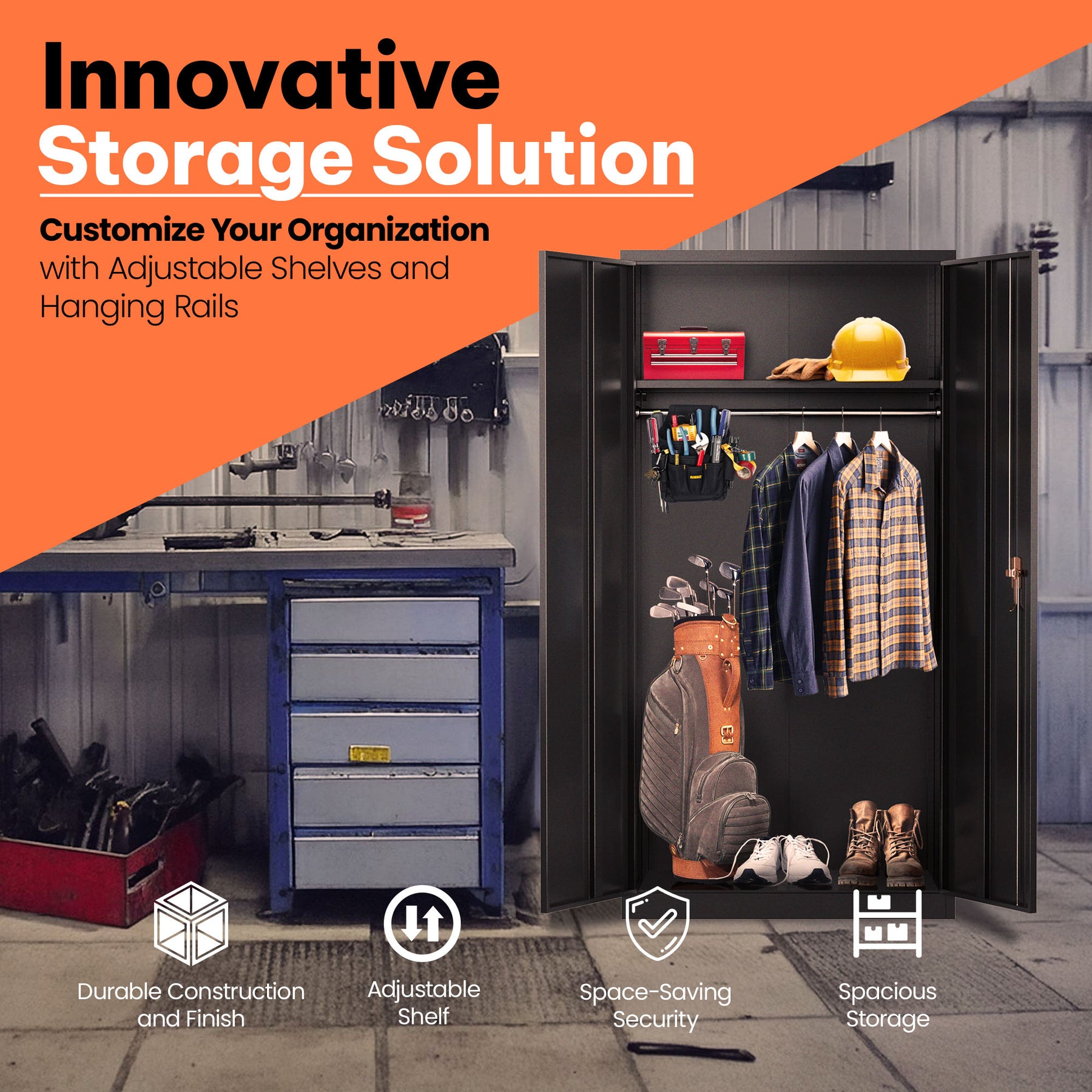 AOBABO Metal Storage Cabinet w/Adjustable Shelf & Cloth Rail, Black (Open Box)