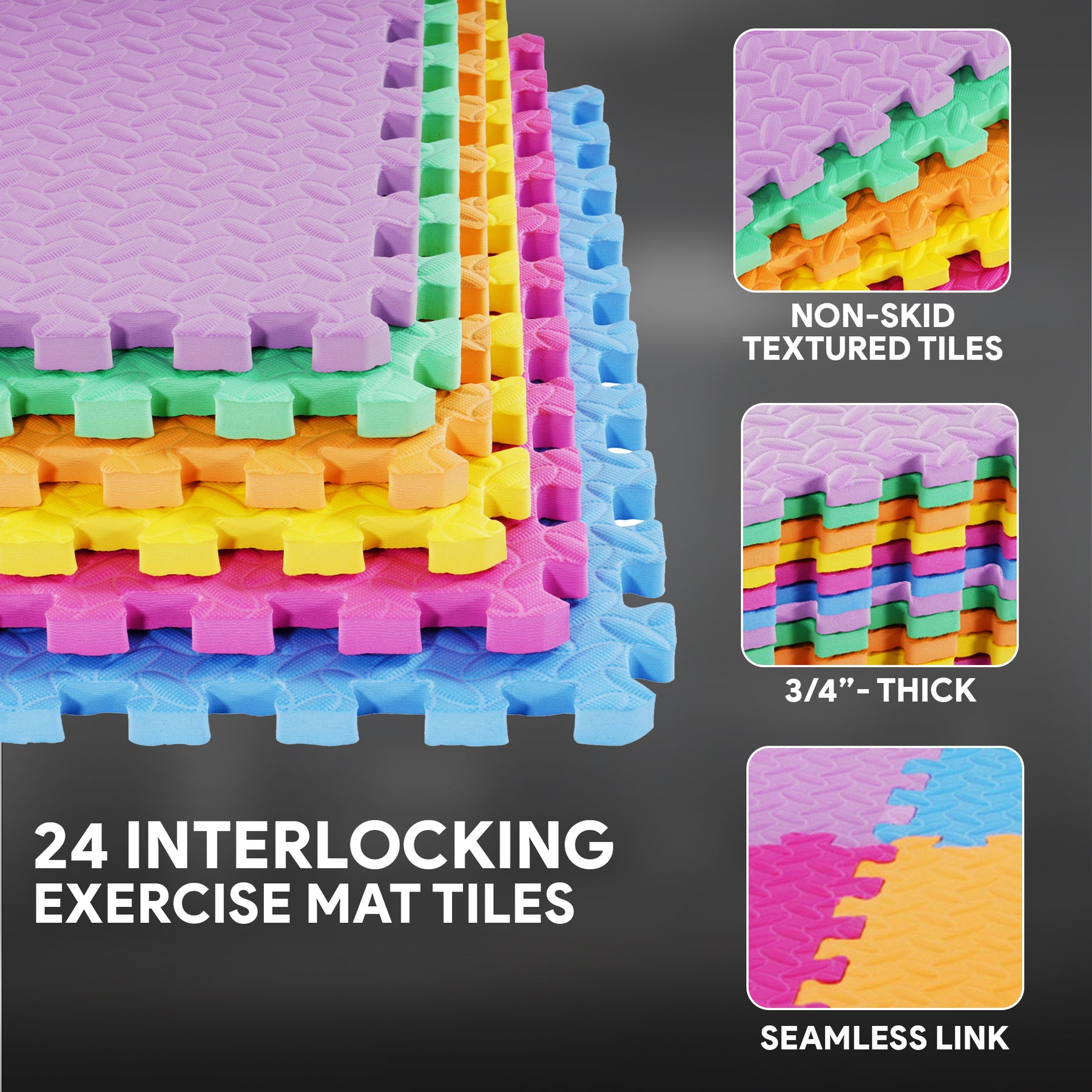• Floor mat with (24) 24 x 24-inch foam exercise tiles with interlocking edges and 48 end borders for 96 square feet of durable support in your home, gym, or daycare