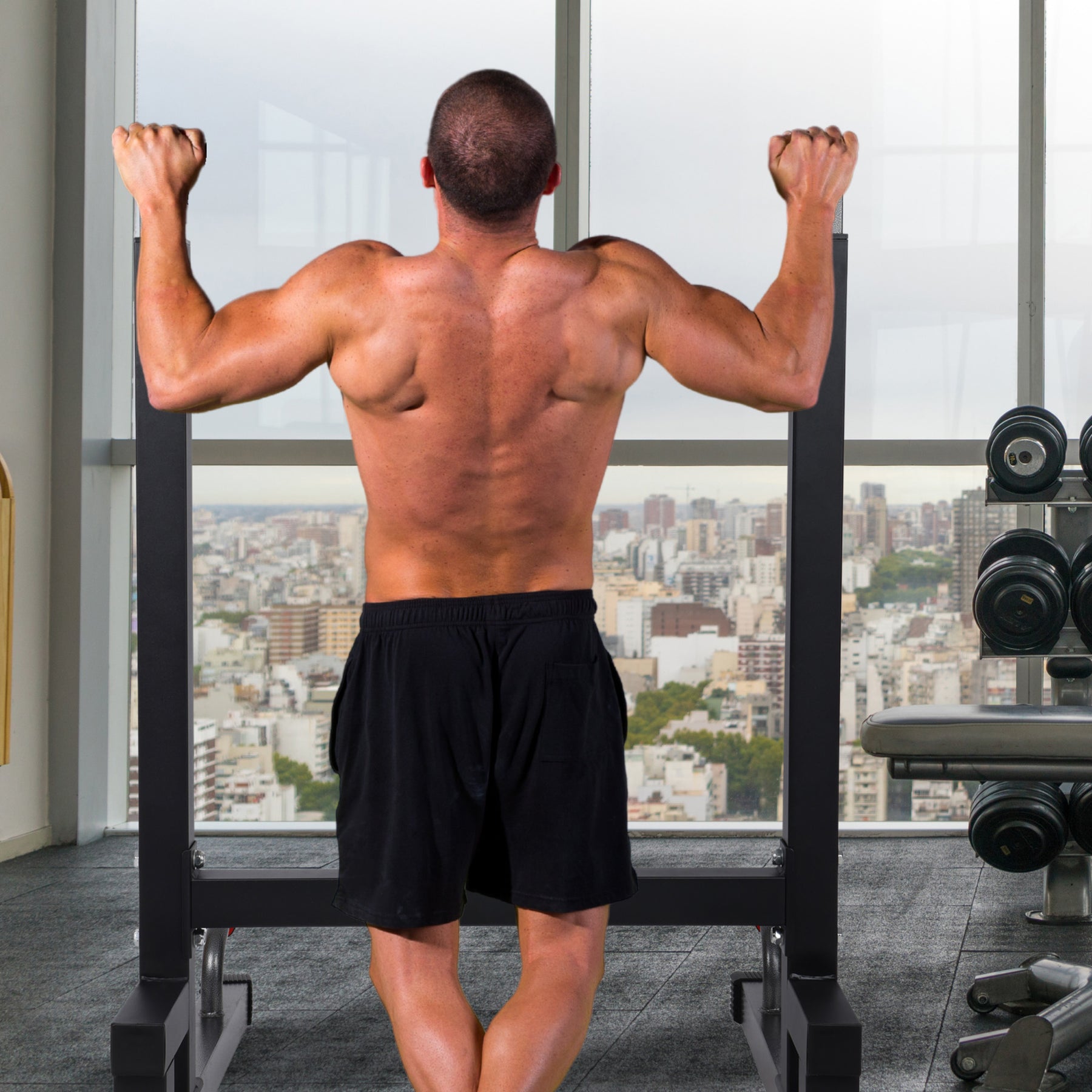 This work out dip station helps develop your triceps and other upper-body muscles with bar exercises, dips, pull-ups, push-ups, leg raises, bench press, and more. The exercise begins when you hold on to the parallel bars with your arms straight and then bend your elbows until your upper arms are parallel to the ground before driving up to the starting position. Featuring a heavy-duty steel frame, the strength training equipment is built with an improved structural design for durability that lasts. Additionally, the non-slip foot pads protect your floor while providing stability and safety while you exercise. Enjoy increased friction and minimized hand fatigue thanks to the foam-padded grip handles and adjust the height from 40 to 51 inches to get the best fit for your at-home fitness routine. Designed with a weight capacity of 500 pounds, this arm workout dip stand is suitable for gym enthusiasts of all kinds.