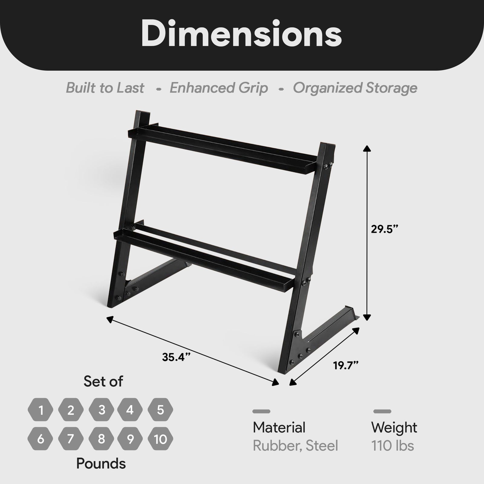 This exercise set has a total weight of 110 pounds spread across 10 pairs of dumbbells ranging from 1 to 10 pounds, making it suitable for users of all fitness levels and exercise preferences. Crafted from durable steel and coated with durable neoprene, these dumbbells are built to withstand the rigors of both indoor and outdoor workouts. The neoprene coating provides a comfortable grip and ensures enhanced durability and resistance to wear and tear over time. Featuring a hexagonal shape, these dumbbells are engineered to stay in place and stop rolling, providing stability and security during your training sessions. Say goodbye to cluttered workout spaces with the convenient weight stand included in the set, keeping your dumbbells organized and easily accessible whenever you're ready to sweat it out. Assembly is a breeze with the included assembly tool, allowing you to quickly set up your weight stand.