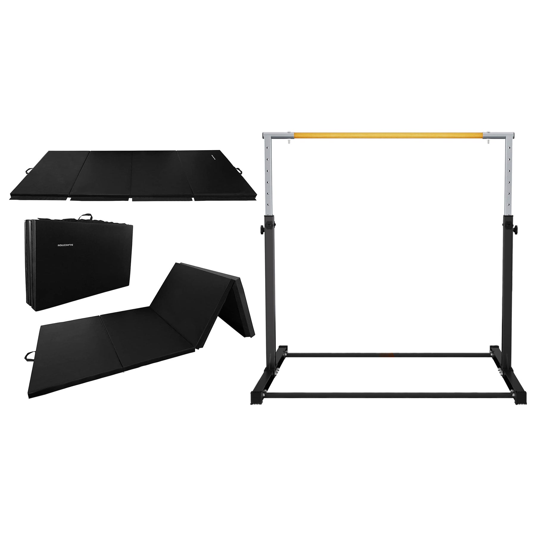 - Long 120 by 48-inch gymnastics mat and adjustable gymnastics bar, perfect for yoga, aerobics, pilates, martial arts, and gymnastics training