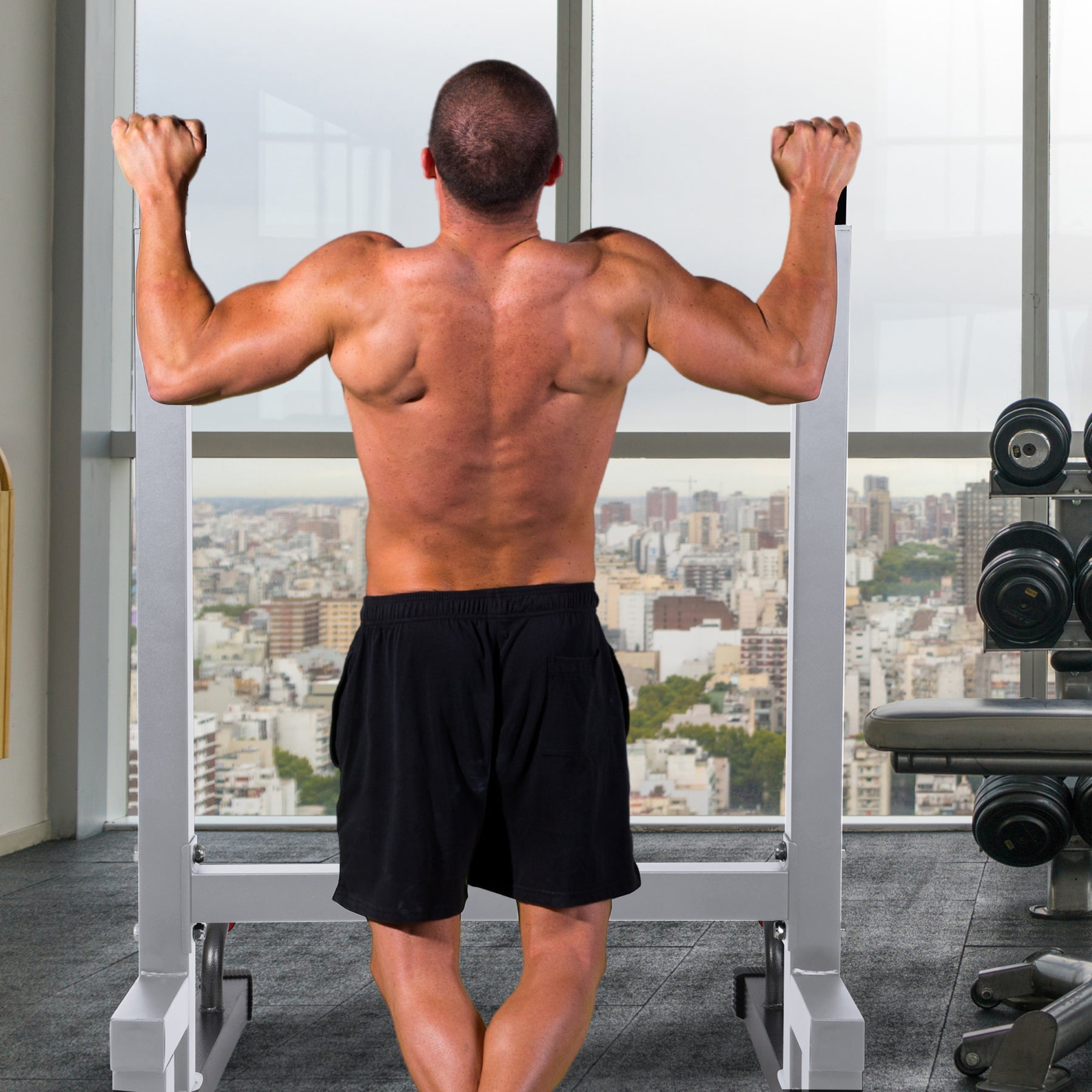 • Dip station develops the triceps and other upper-body muscles with bar exercises, dips, pull-ups, push-ups, leg raises, bench presses, and more