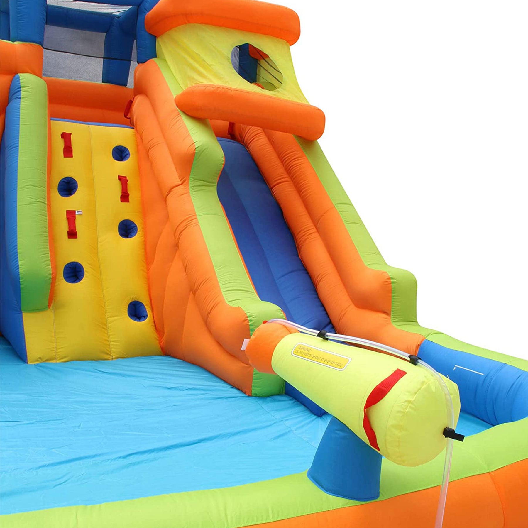 • Inflatable water park with a plunge drop, curved slide, and oversized lagoon splash pool