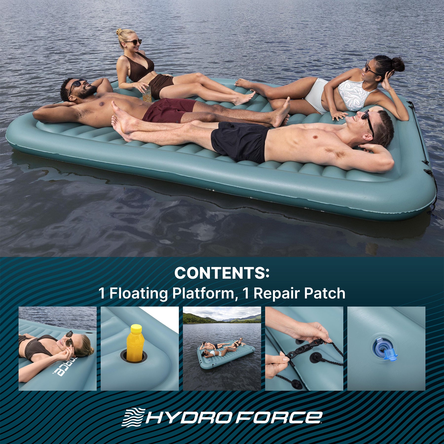 • Large water floating platform is the perfect size for up to 4 people with an overall weight capacity of 880 pounds