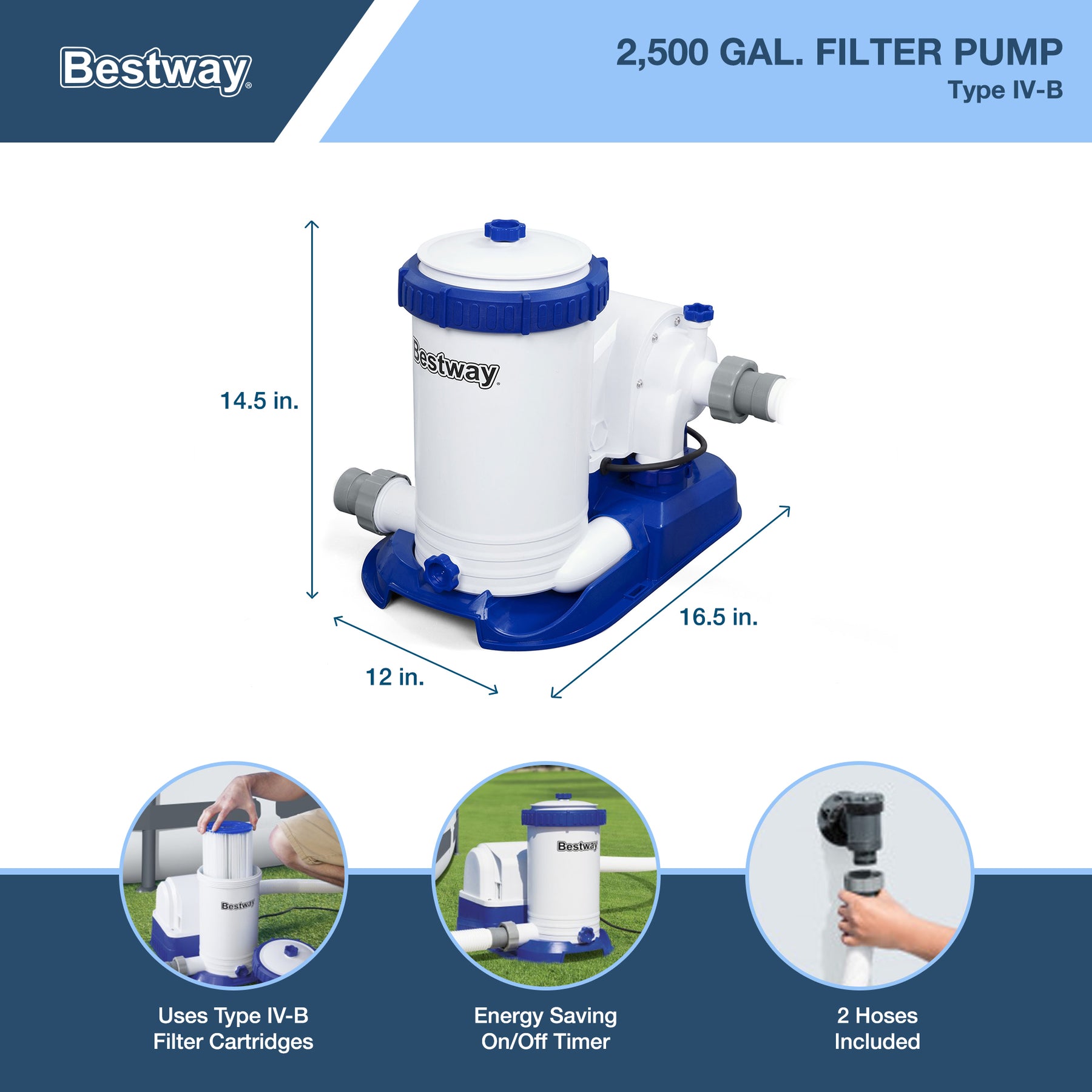 • Includes 110 to 120-volt filter pump with 2,500-gallon per hour water flow rate and replacement cartridge, ladder, pool cover, ChemConnect dispenser, and repair patch