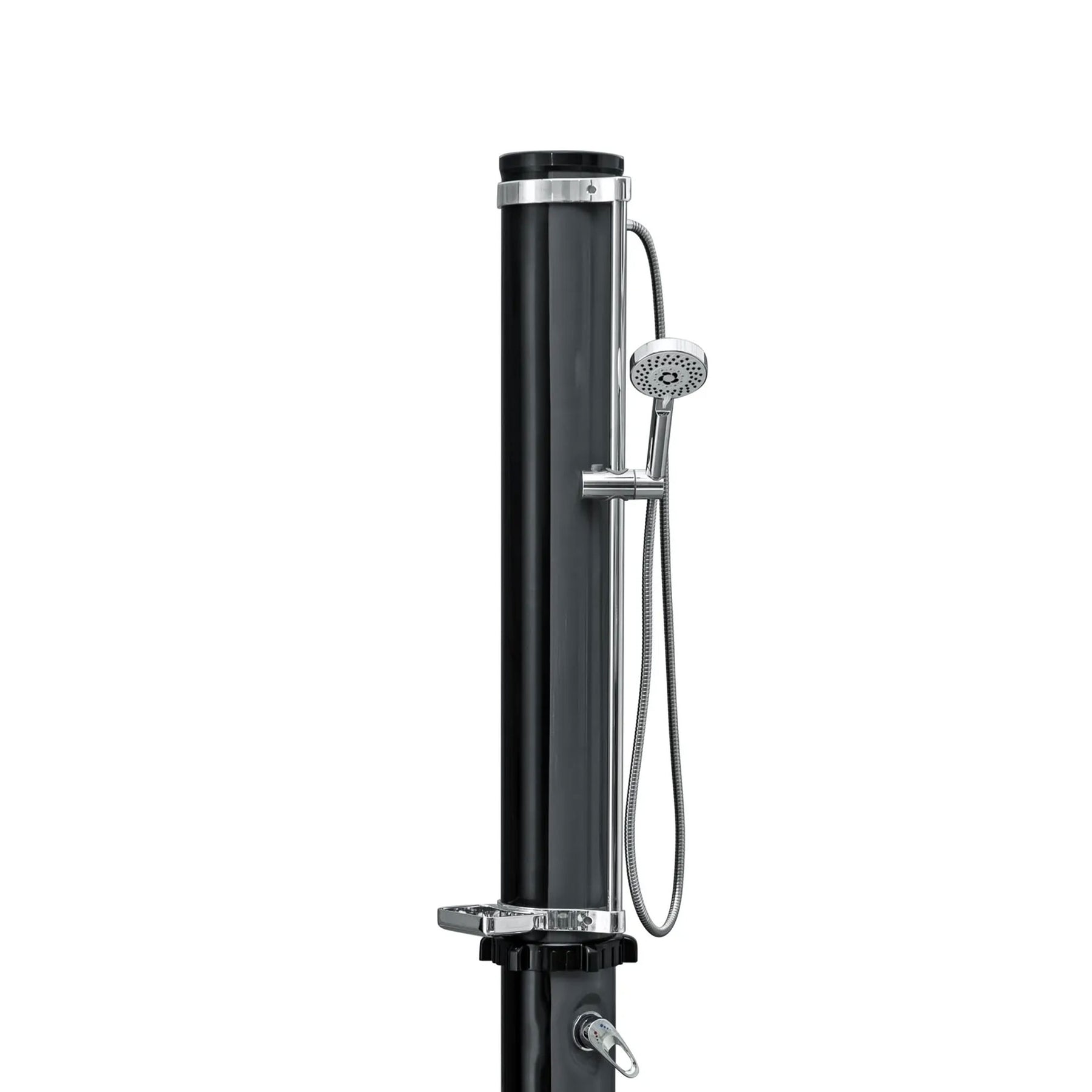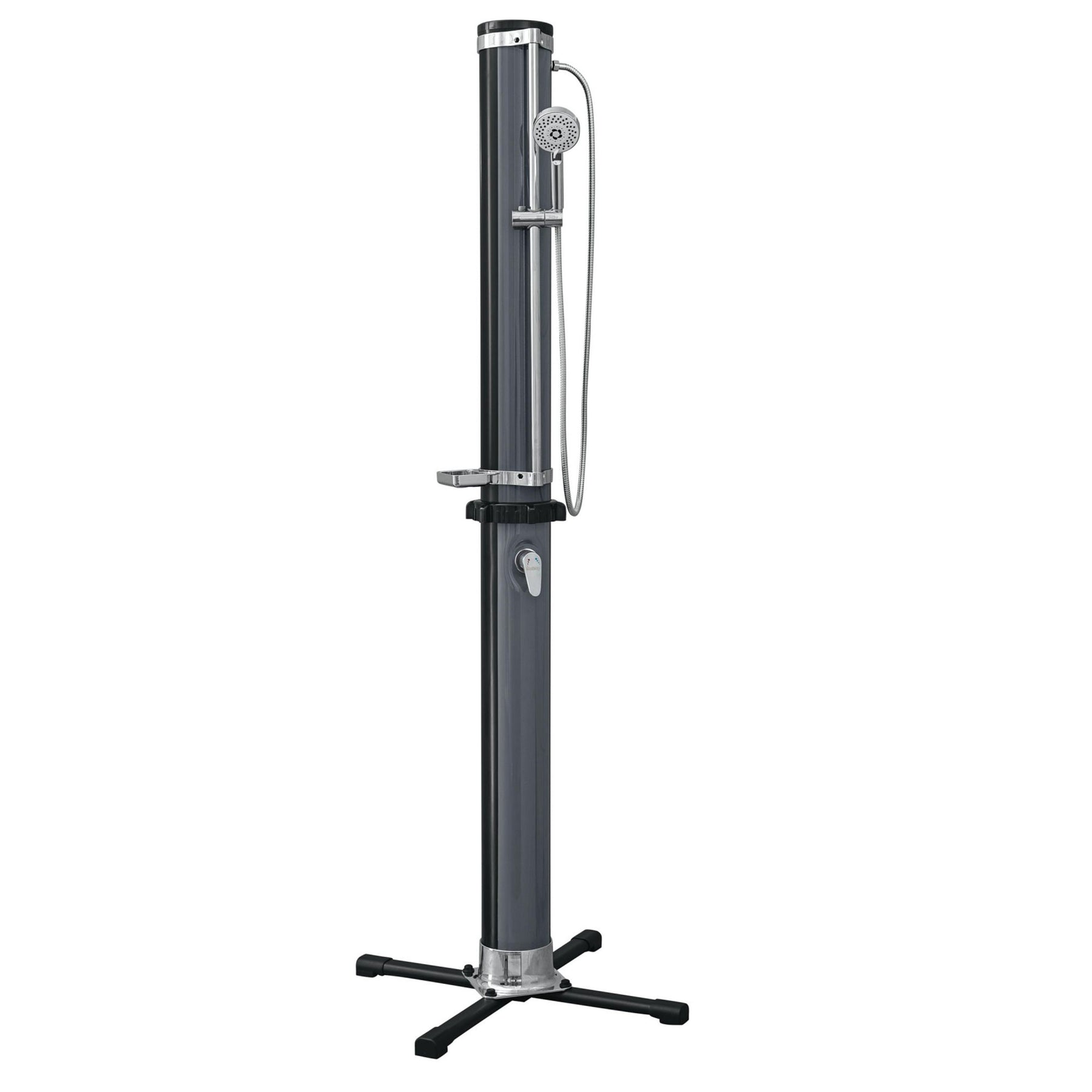 • Black and gray designed shower holds 9.2-gallon of water in the reservoir tank, which is warmed by the solar heating feature when left filled