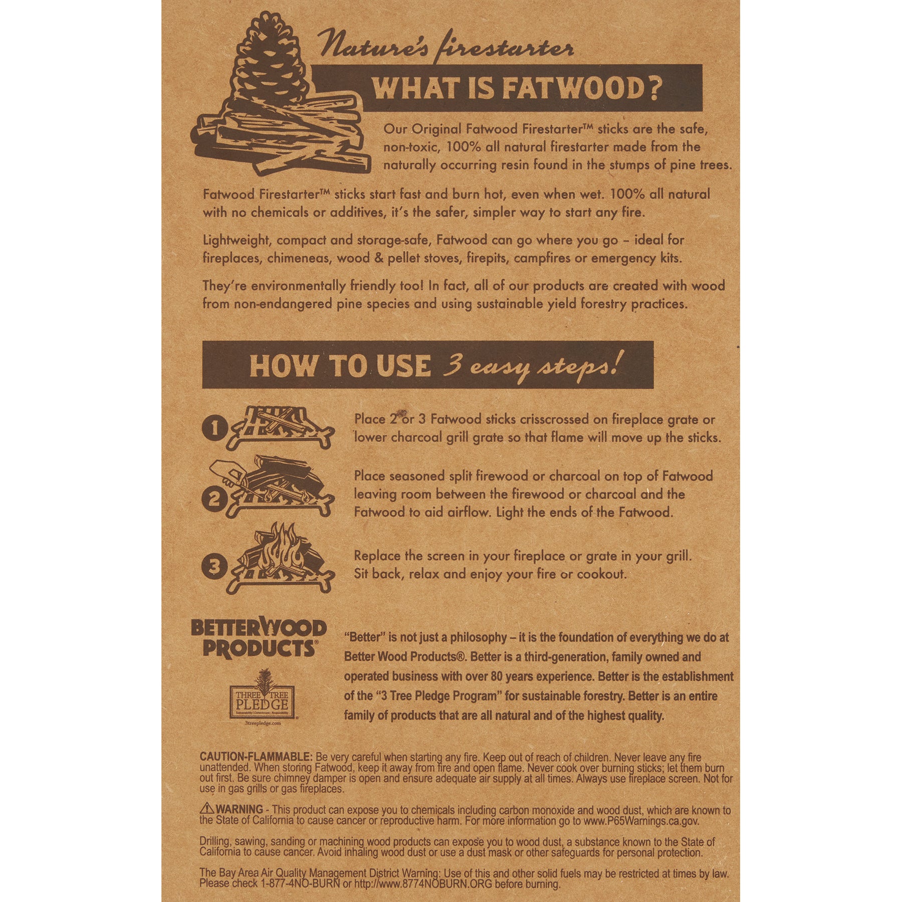• Fatwood sticks start fast and burn hot, even when wet, for a stress-free way to get your fire going