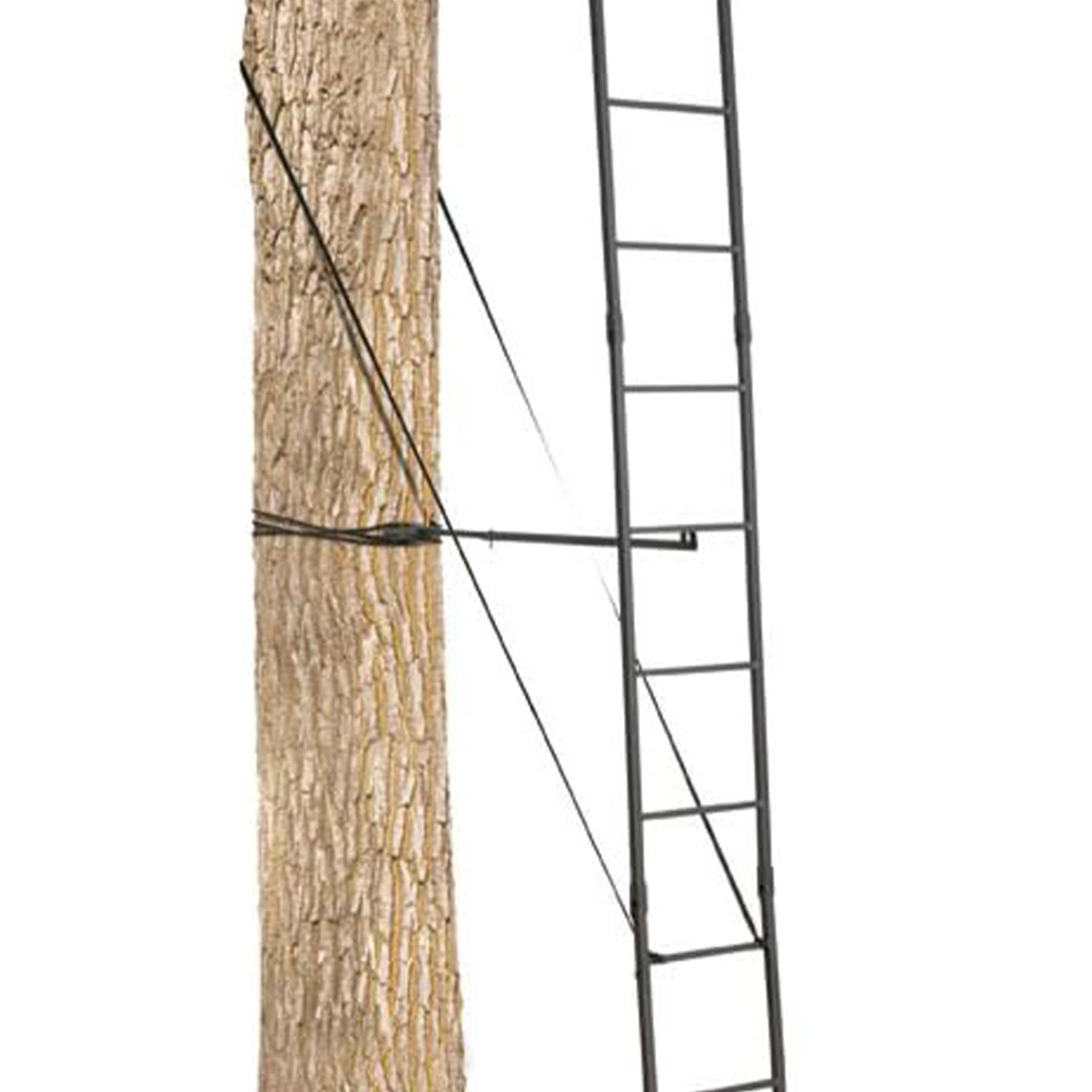 Built with durable steel materials with padded armrests and a padded shooting rail, this stand is the true balance of strength and comfort. The Flex-Tek contours to your back and legs and features a 360-degree rotation design, meaning you'll always have a good chance at the perfect shot. The ultra-strong construction of the ladder stand can support up to 600 pounds, so no need to hunt alone. Including the stand itself with an adjustable support bar, a 1-inch ratchet strap, and (2) 1-inch stabilizer straps, this piece of hunting equipment will set you up for an ideal day outdoors.