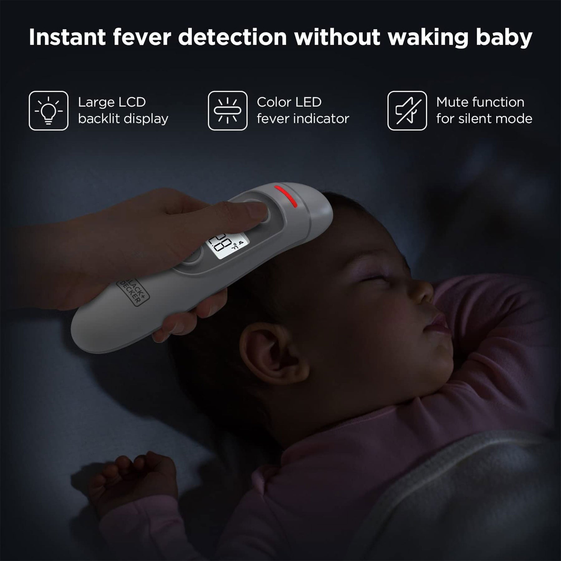 • Fever alarm further indicates a potential fever; Features a mute function in case your baby is sleeping