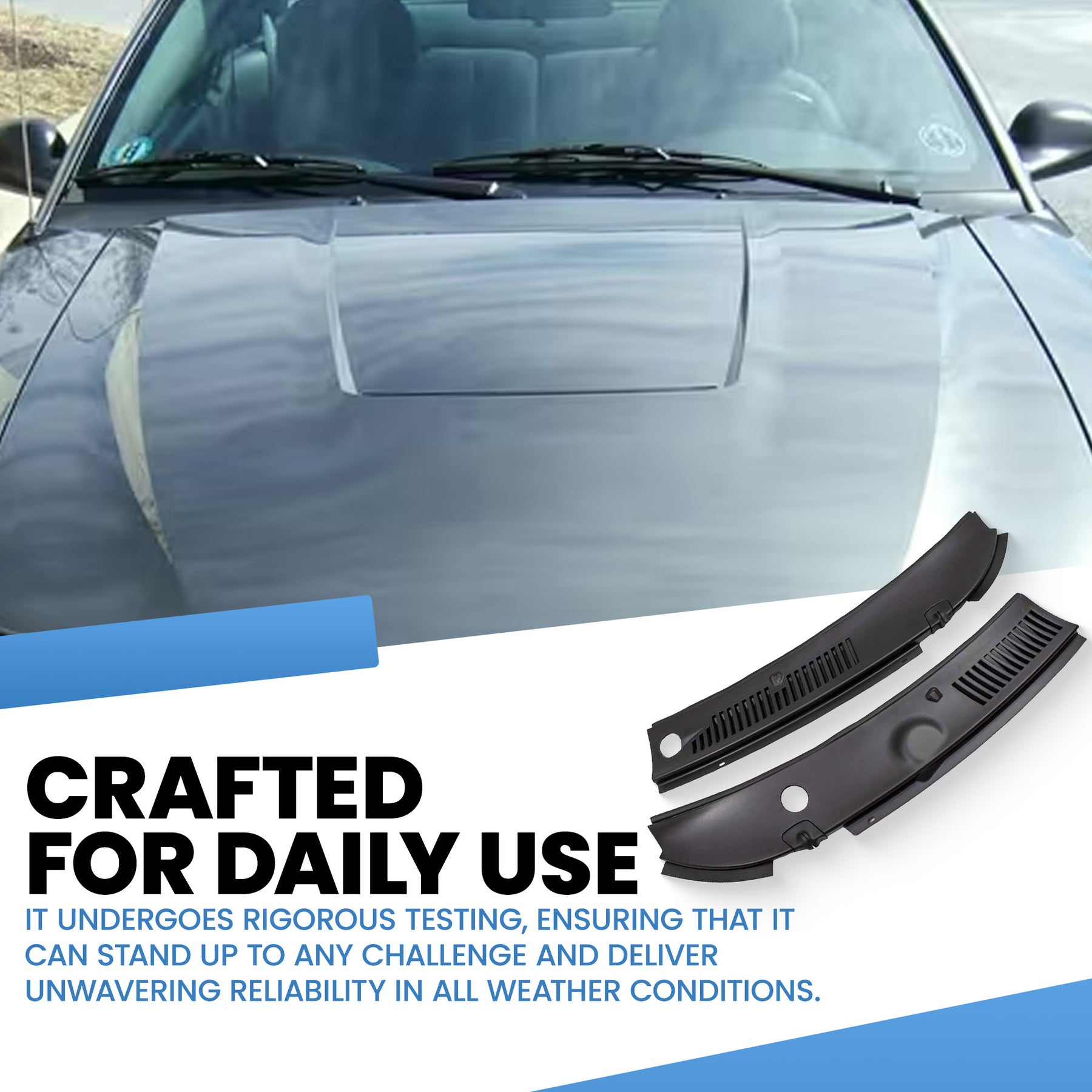 This cowl grille is a testament to superior engineering. Crafted from top-tier components, it undergoes rigorous testing, ensuring that it can stand up to any challenge and deliver unwavering reliability in all weather conditions. No matter what nature throws your way, this assembly remains steadfast with its fade-resistant texture and color matching. It will continue to exude a showroom shine, even in the harshest environments, preserving your Mustang's timeless beauty.