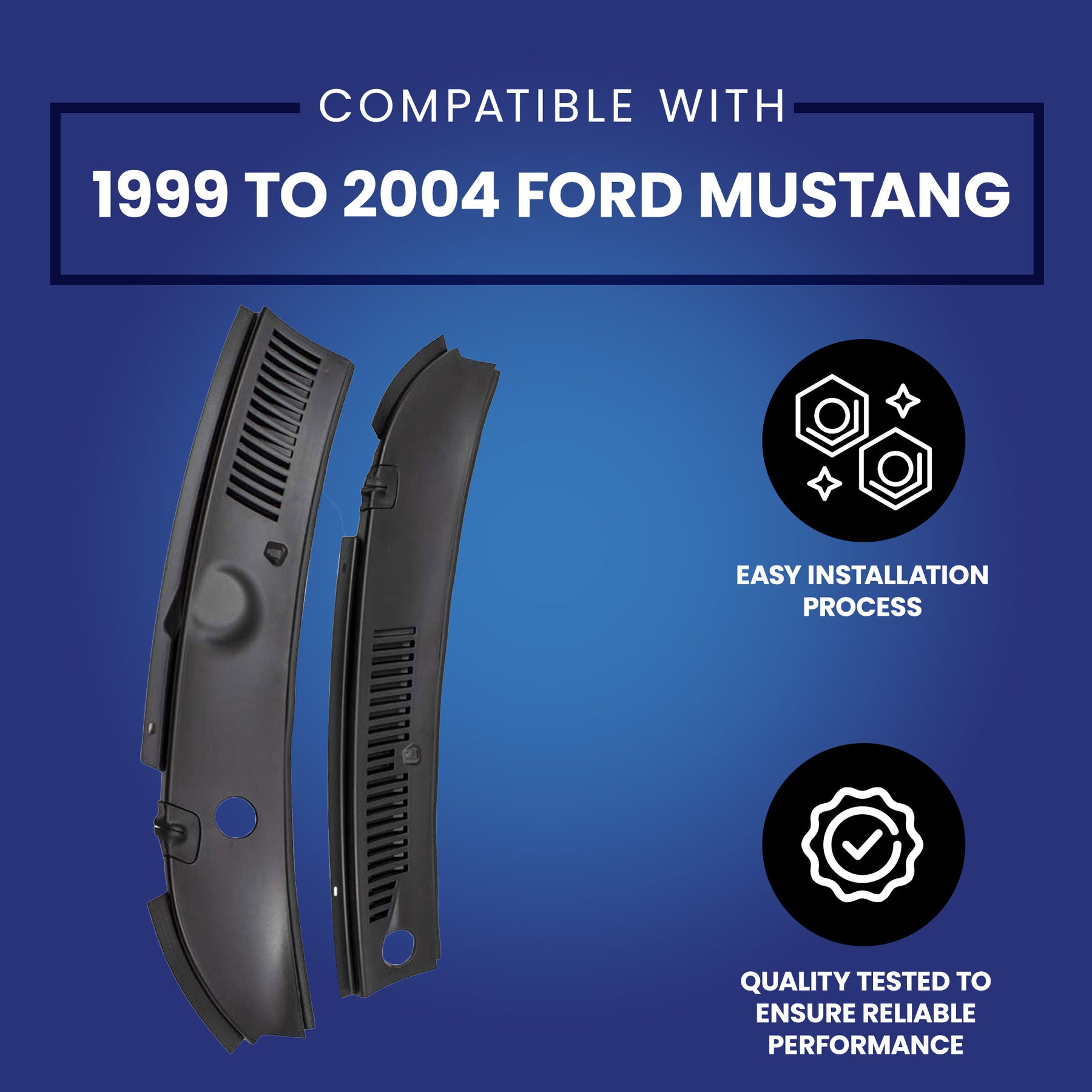 • Upgrade your vehicle's appearance and functionality with this 2-piece cowl grille assembly; Compatible with models 1999 to 2004 Mustang