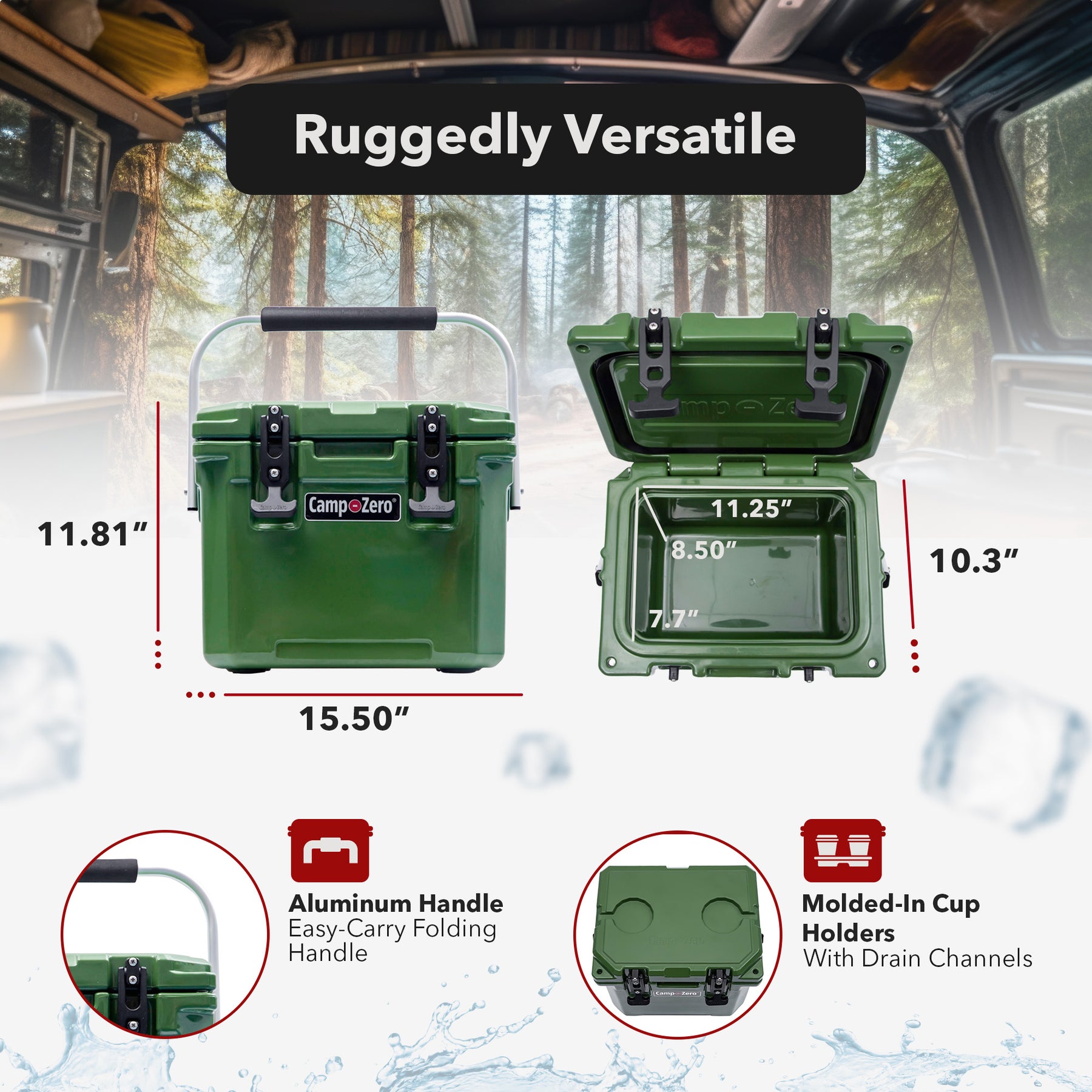 - Comes with 2 molded-in cup holders with drain channels, textured lid, and feet to enhance usability and stability for outdoor activities