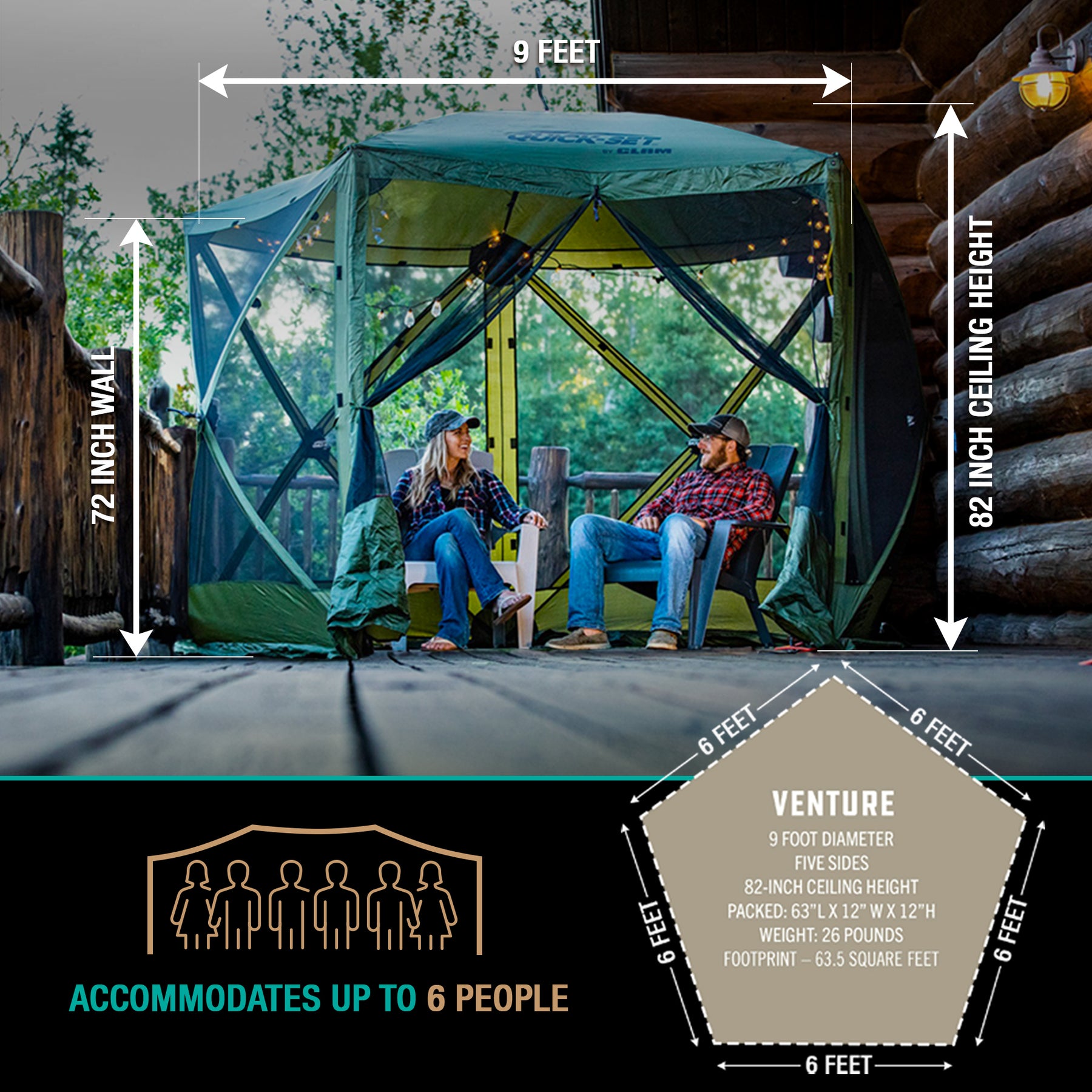 • Set-up inner dimensions measure 9 feet across and 6.8 feet at center height; Hub to hub measures 108 inches wide and 108 inches long; Packed size measures 7.5 inches long by 7.5 inches wide by 5.2 feet tall