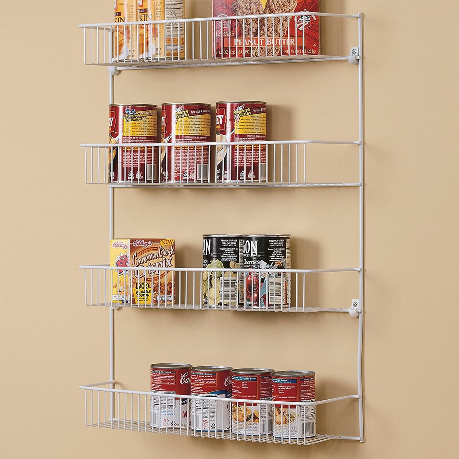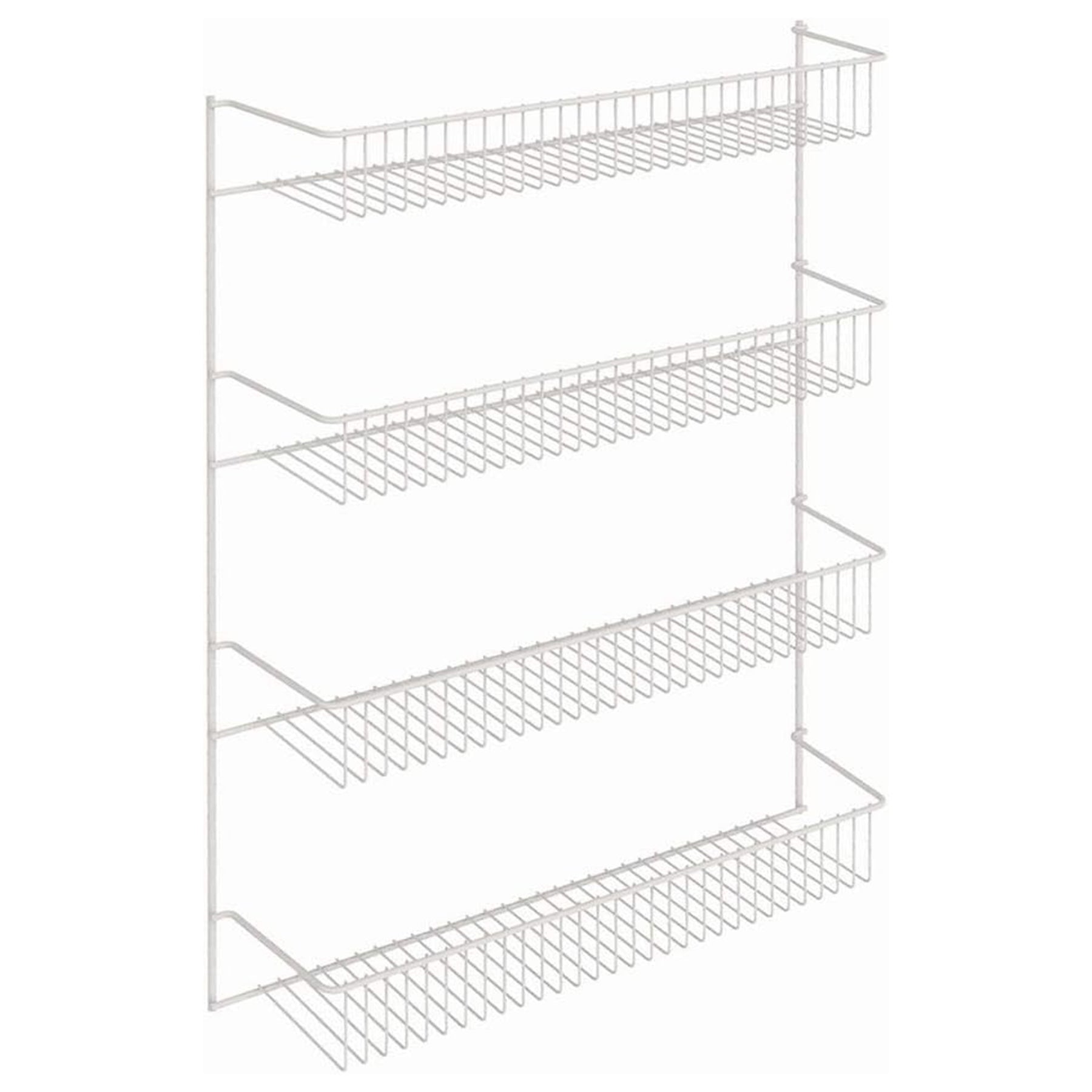 • Rack organizer with door or wall mount and 4 tiers for eliminating clutter and storing kitchen, pantry, or cleaning supplies