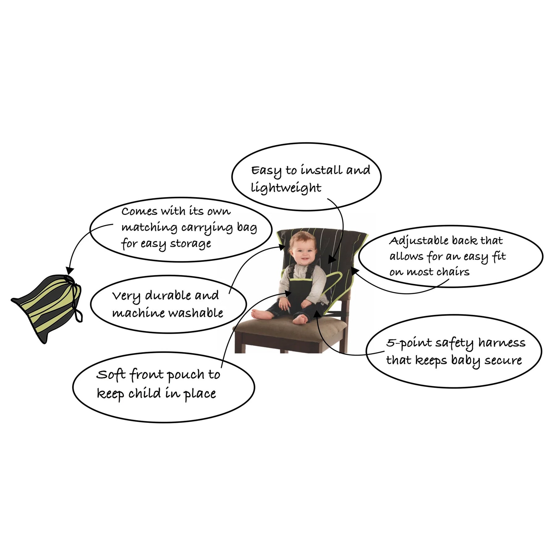 • Portable and lightweight high chair solution for traveling, eating out, and visiting grandparents