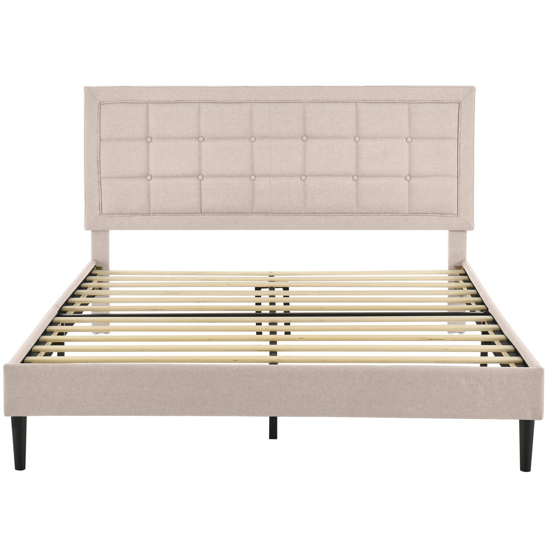 - Premium linen-upholstered headboard features clean lines for a timeless look