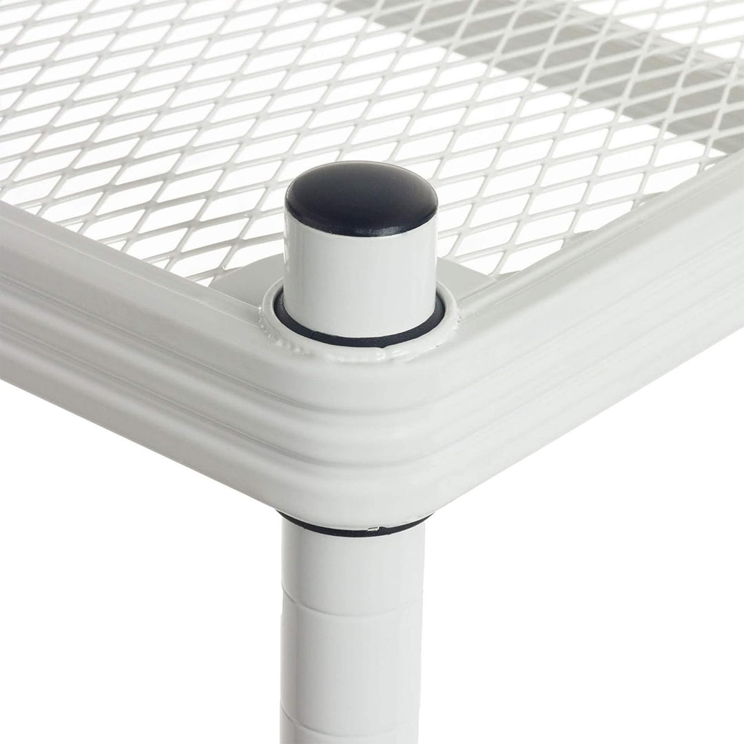 Featuring a heavy-duty steel metal mesh design and epoxy coating, each shelf from this standing shelf unit is capable of holding up to 440 pounds. With the expanded metal mesh shelving, this multipurpose display shelf rack will not let bottles, cans, or other small items fall through. This shelving rack for pantry storage gives you the ability to customize your space as you can add caster wheels (sold separately) giving you your own unique storage freedom.