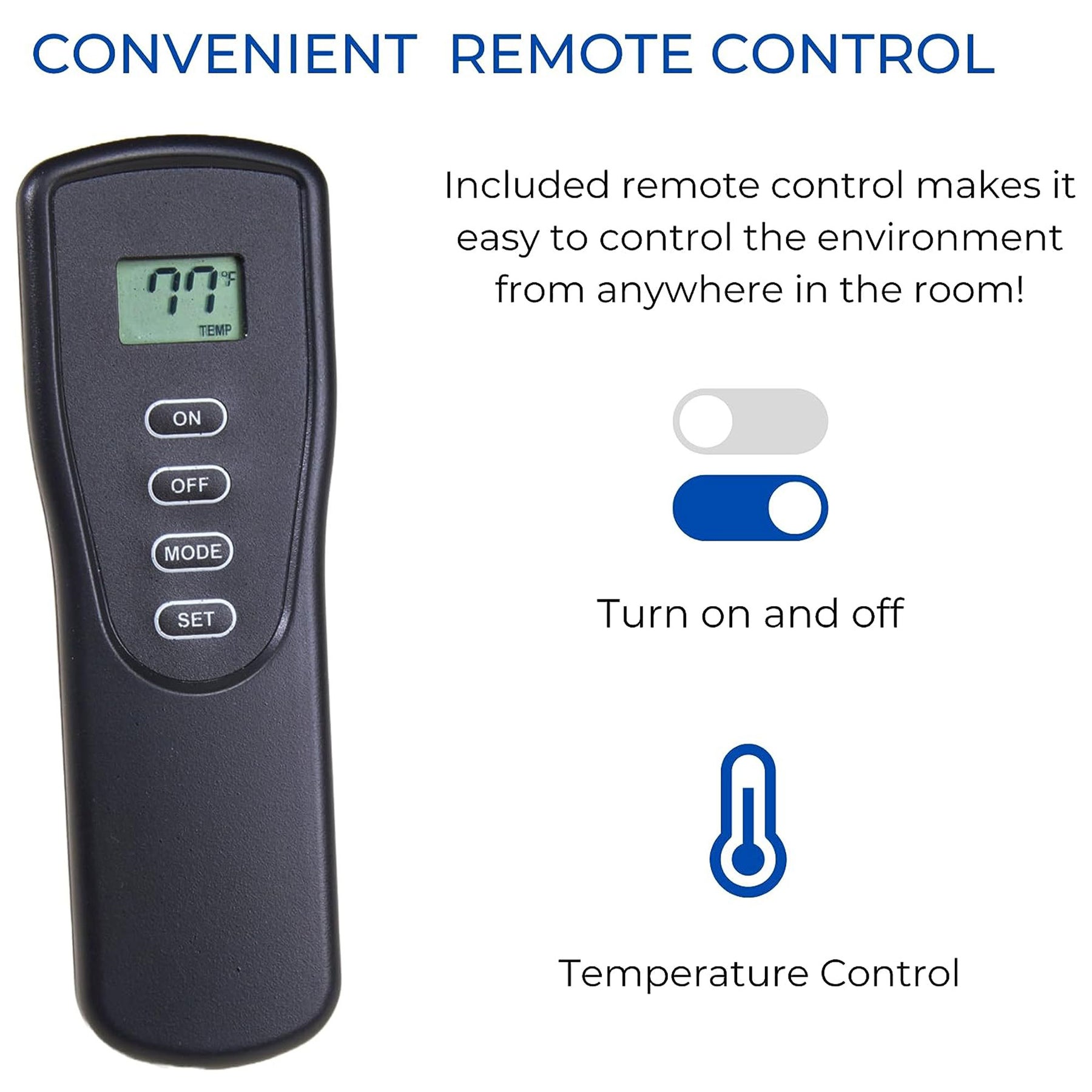 - Remote control lets you customize the heat in your room for optimal convenience