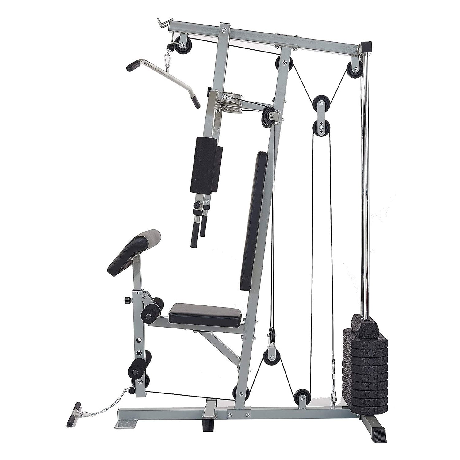 This workout equipment is perfect for anyone interested in fitness, from beginner to pro, and is suitable for user weight up to 400 pounds. Adjust your preferred weight with the included weight stack with a max of 330-pound resistance to make you sweat and shred. The high and low pulley system (total 12 pulleys) provides a smooth fluid motion with every movement and helps strengthen various muscles throughout your back, arms, and core. Use the detachable wide-grip lat bar or row bar to target specific arm muscle groups while the 4-roll leg developer is perfect for leg day exercises.