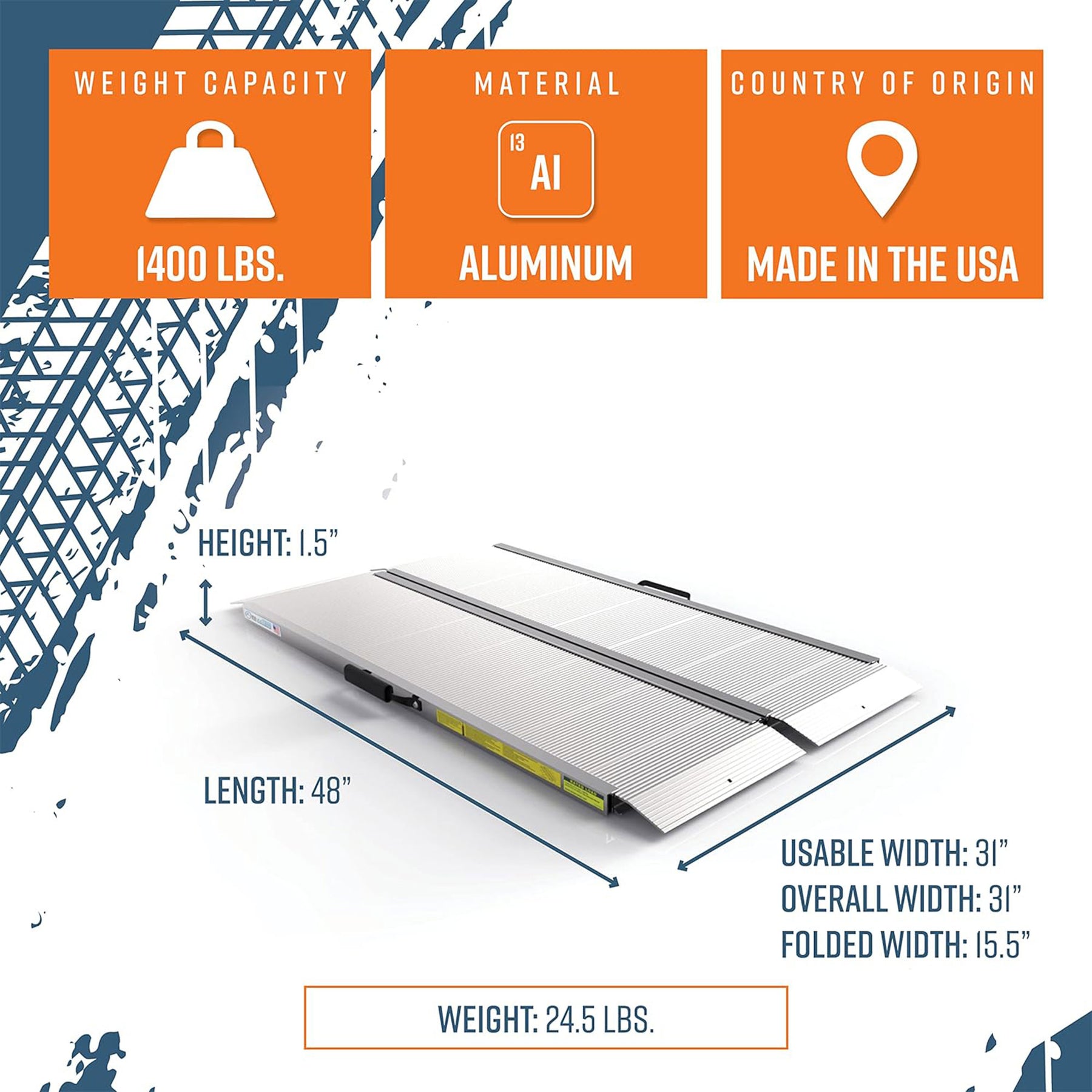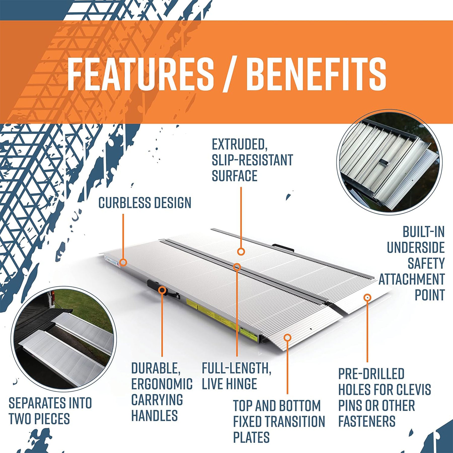 - Easily foldable to a compact 15.48-inch width and can be conveniently stowed in a truck, trailer, shed, or van; Durable handles provide a comfortable grip for easy carrying without compromising the ramp's functionality