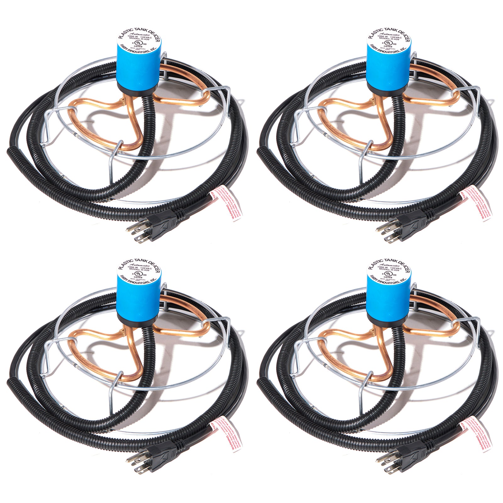 - Pack of 4 water deicers designed to rest at the bottom of watering tanks used around the farm and home