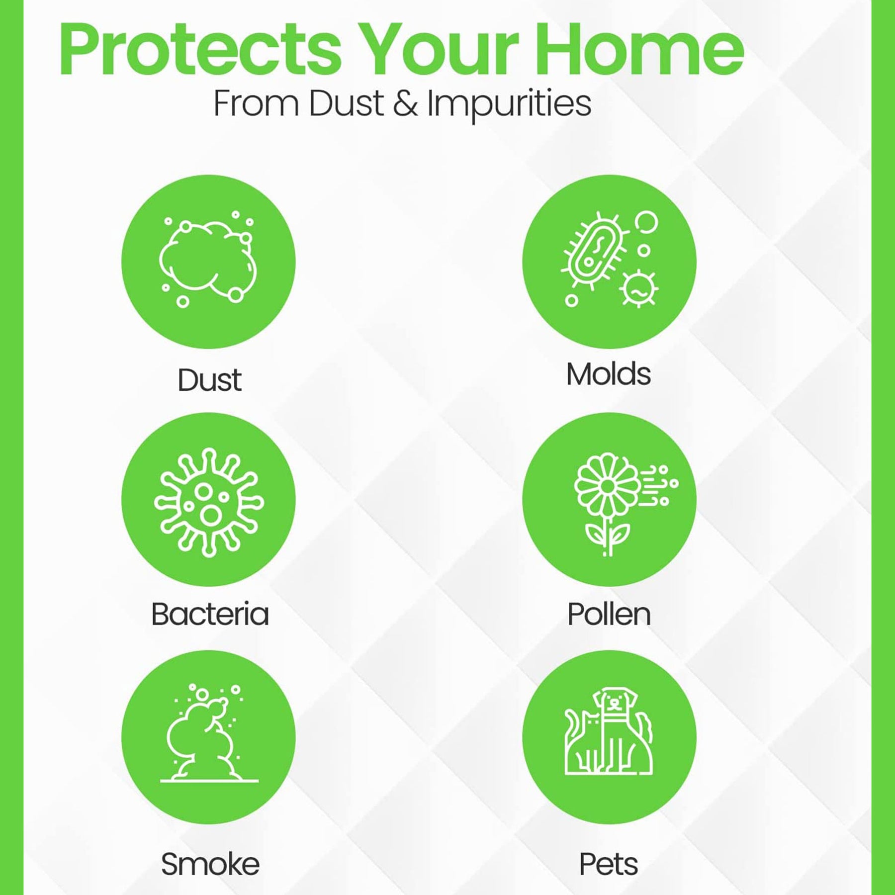 - Filters out and captures dust, pollen, pet dander, smoke, and other particles
