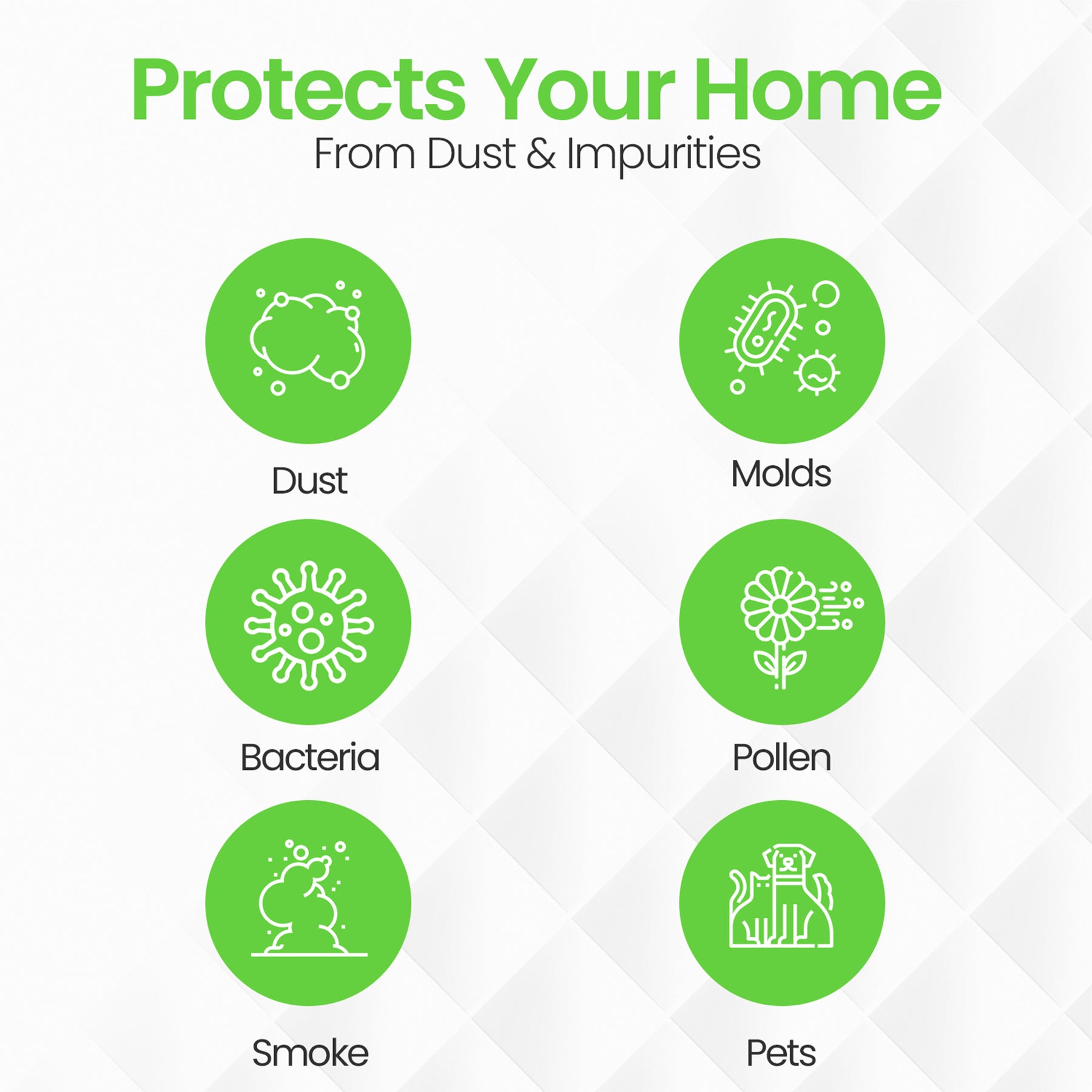 • Filters out and captures dust, pollen, pet dander, smoke, and other particles