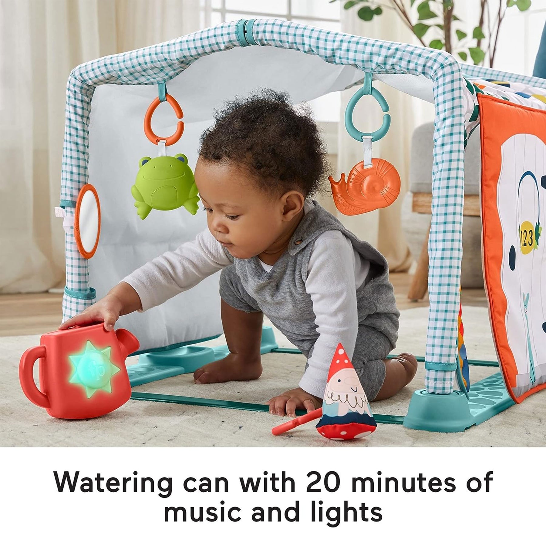 • Includes 5 engaging baby toys with a self-discovering mirror, frog rattle, snail teether, crinkle garden gnome, and roly-poly watering can
