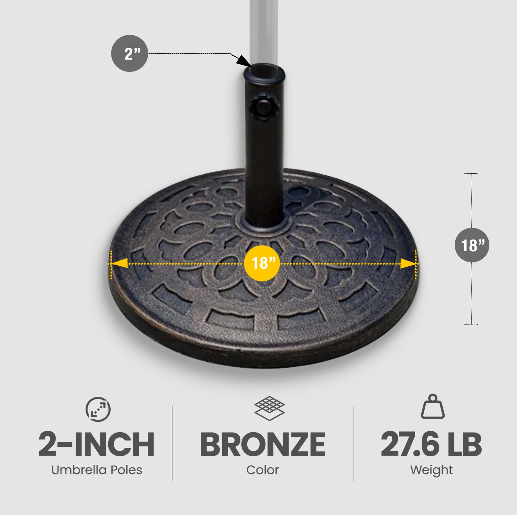 With its impressive 18-inch diameter, this patio umbrella holder provides stability and adds a touch of elegance to your patio or garden. Crafted from top-quality bronze and composite materials, this umbrella accessory effortlessly combines durability with a sophisticated aesthetic. Designed to accommodate umbrella poles up to 2 inches in diameter, this versatile umbrella base ensures compatibility with a wide range of outdoor umbrellas, allowing you to choose the ideal shade for your setting. Whether you're hosting a summer brunch, relaxing by the pool, or enjoying a quiet evening under the stars, this outdoor essential is the ideal foundation for a stylish and functional outdoor oasis. Weighing 27.6 pounds, this umbrella base is engineered to withstand various weather conditions, providing reliable support even on windy days. Say goodbye to worries about your umbrella tipping over or being displaced by the elements, as this composite umbrella base is a practical accessory and a statement piece that enhances your outdoor space's overall look and feel.