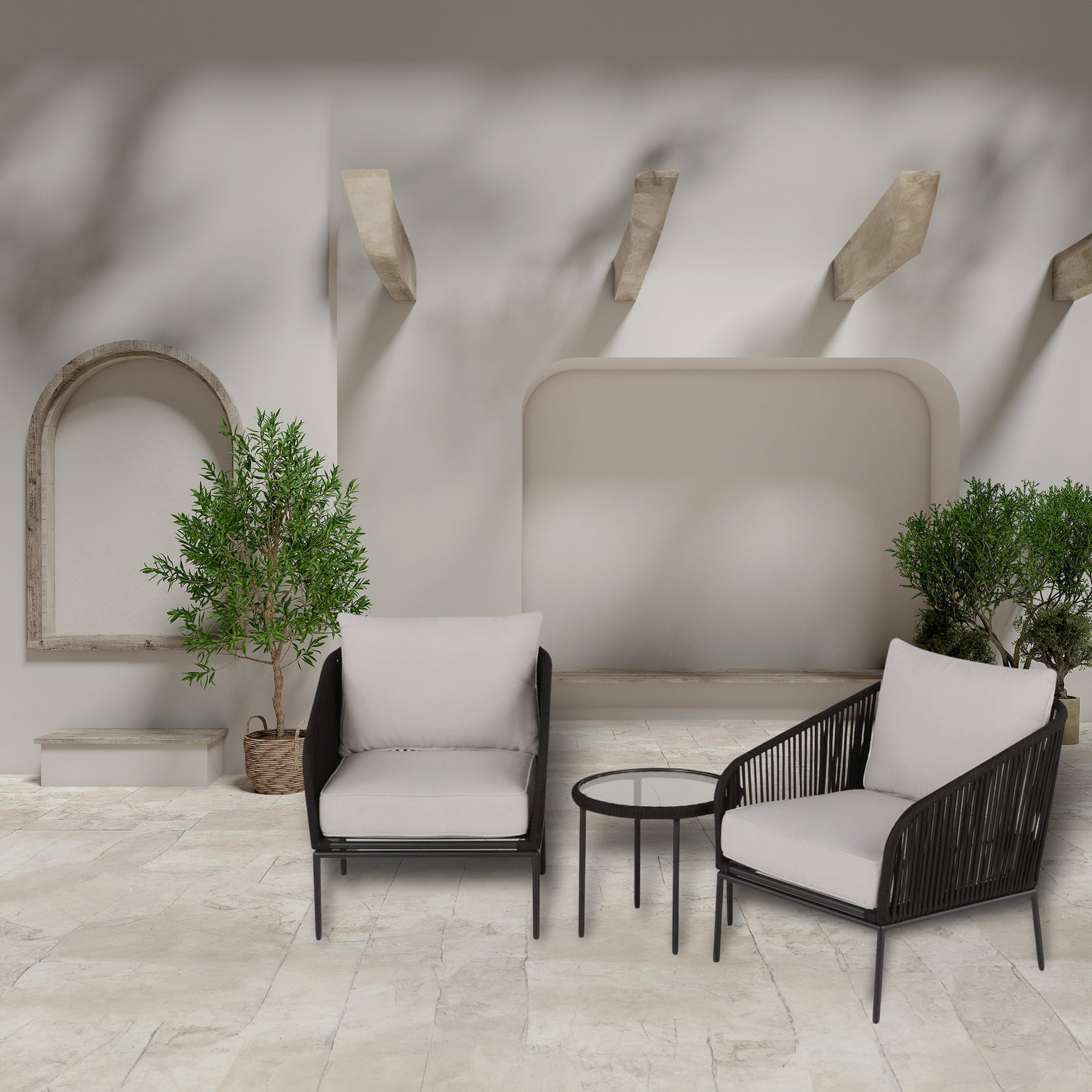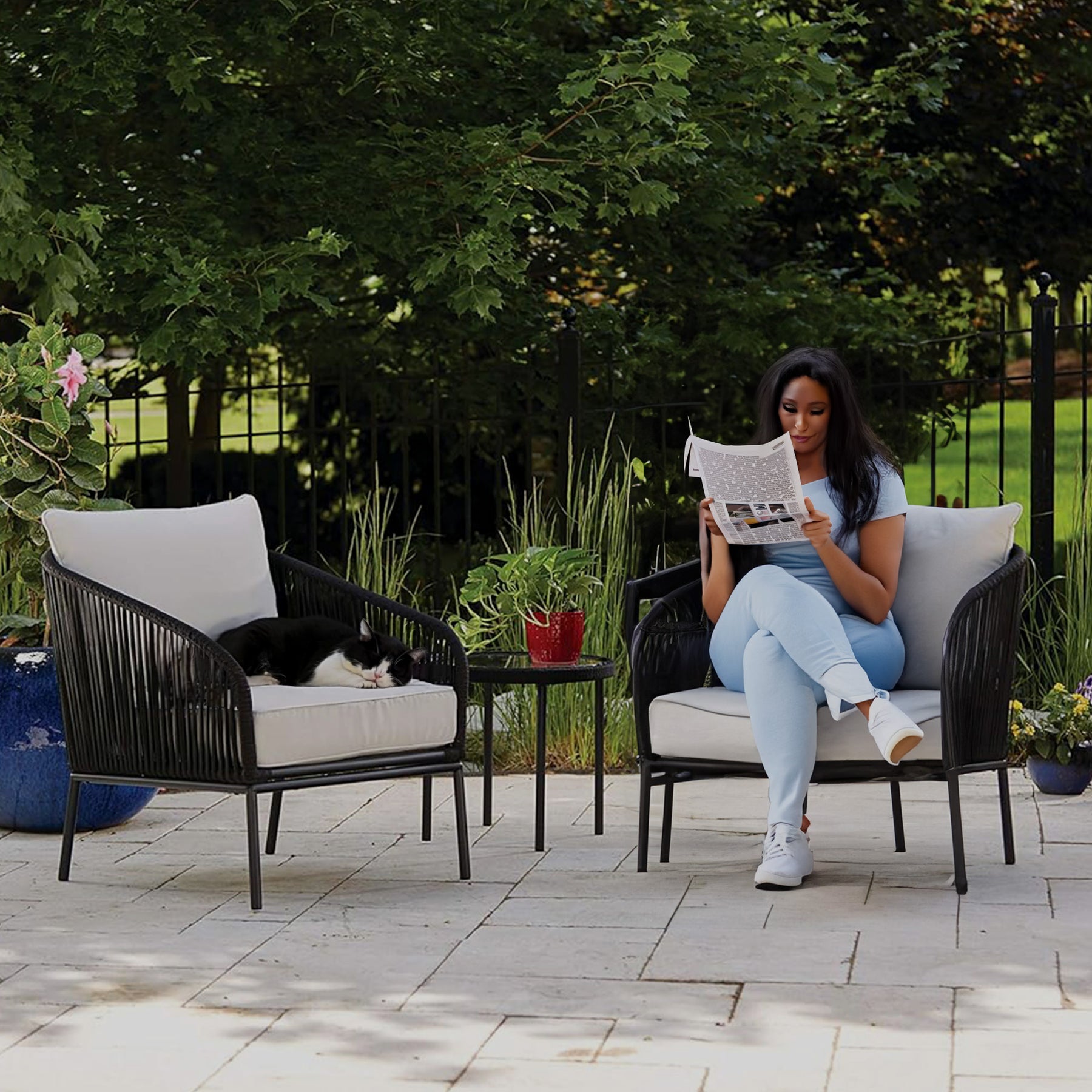 - Savor comfort, admire chic aesthetics, and relax in peace with this patio chat set