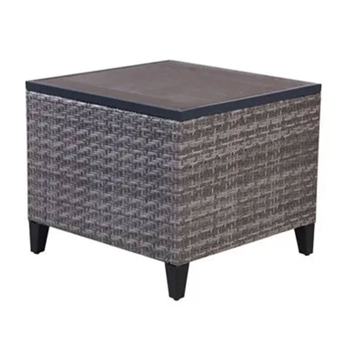 Crafted with precision, this side table boasts a hand-woven design using durable all-weather wicker in a captivating multi-tonal shade of light gray. The attention to detail extends to its sturdy frame, this patio essential is constructed from powder-coated aluminum for exceptional longevity. Designed for both style and functionality, the removable faux wood top not only enhances the aesthetic appeal but also provides convenient access to an interior storage area. With dimensions of 27.95 by 27.95 by 24.02, this patio table offers a versatile surface for your outdoor essentials.