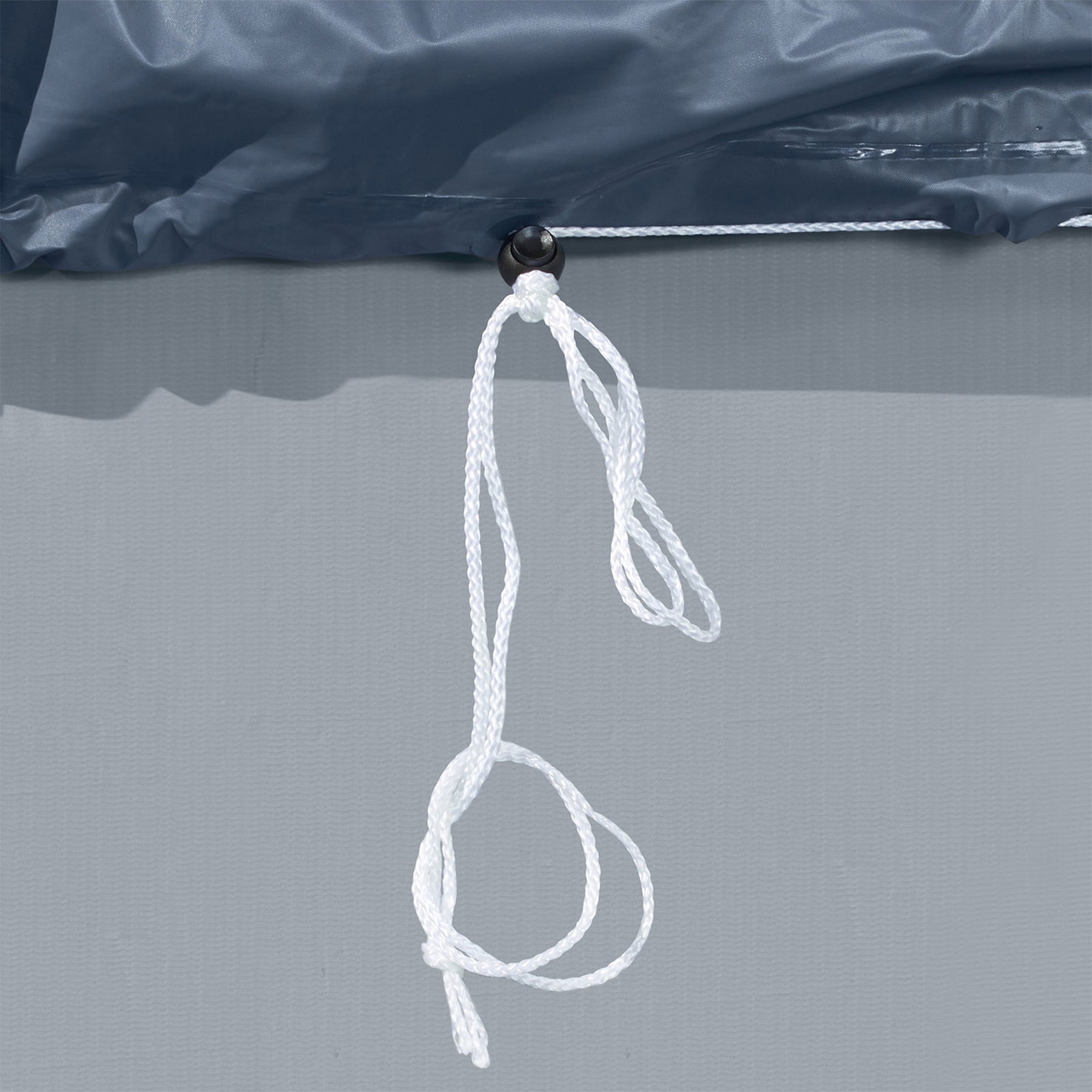 - Featuring an adjustable drawstring, this cover simplifies the pool protection process by spreading it over the water's surface and easily securing it by pulling the drawstring tight, providing quick and efficient coverage