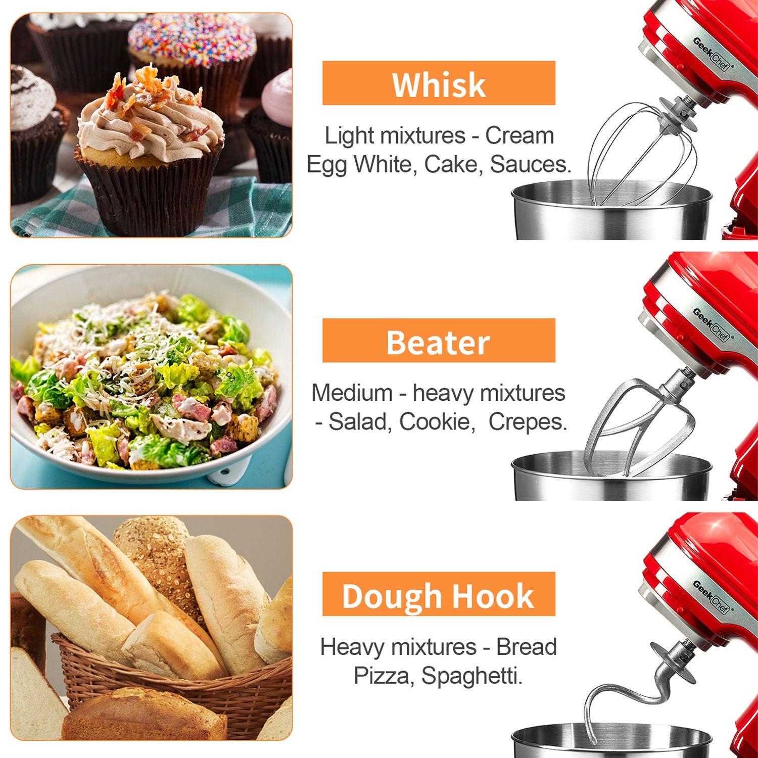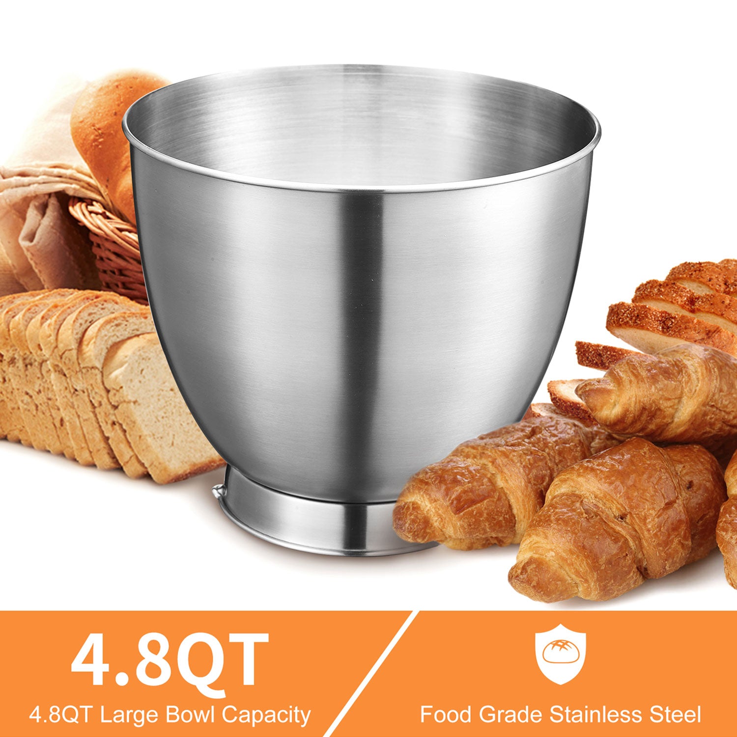 • Baking stand mixer with 4.8-quart, stainless steel bowl, and 3 attachments (beater, dough hook, balloon whisk)