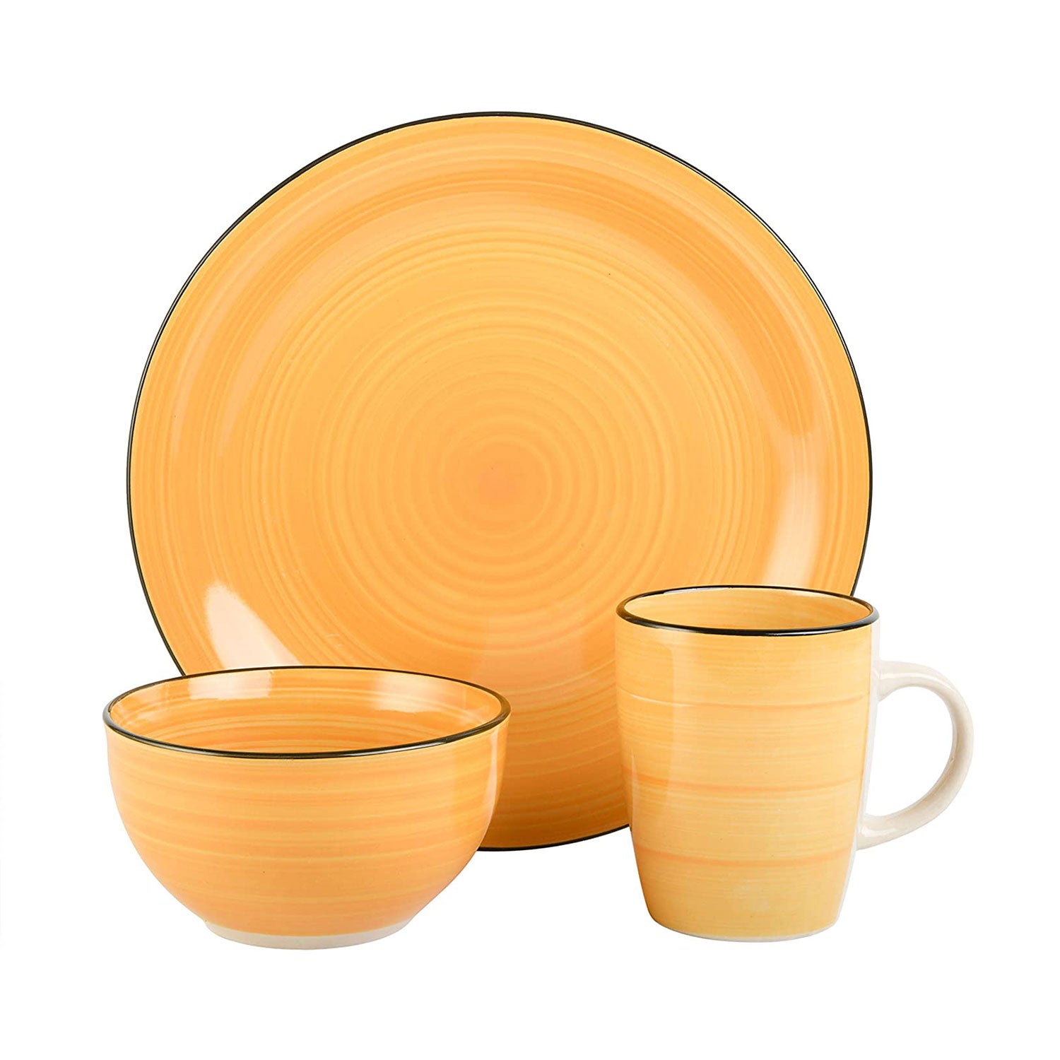 • Multi-colored set includes (4) 10.5-inch dinner plates, (4) 5.25-inch cereal bowls, and (4) 12-ounce mugs