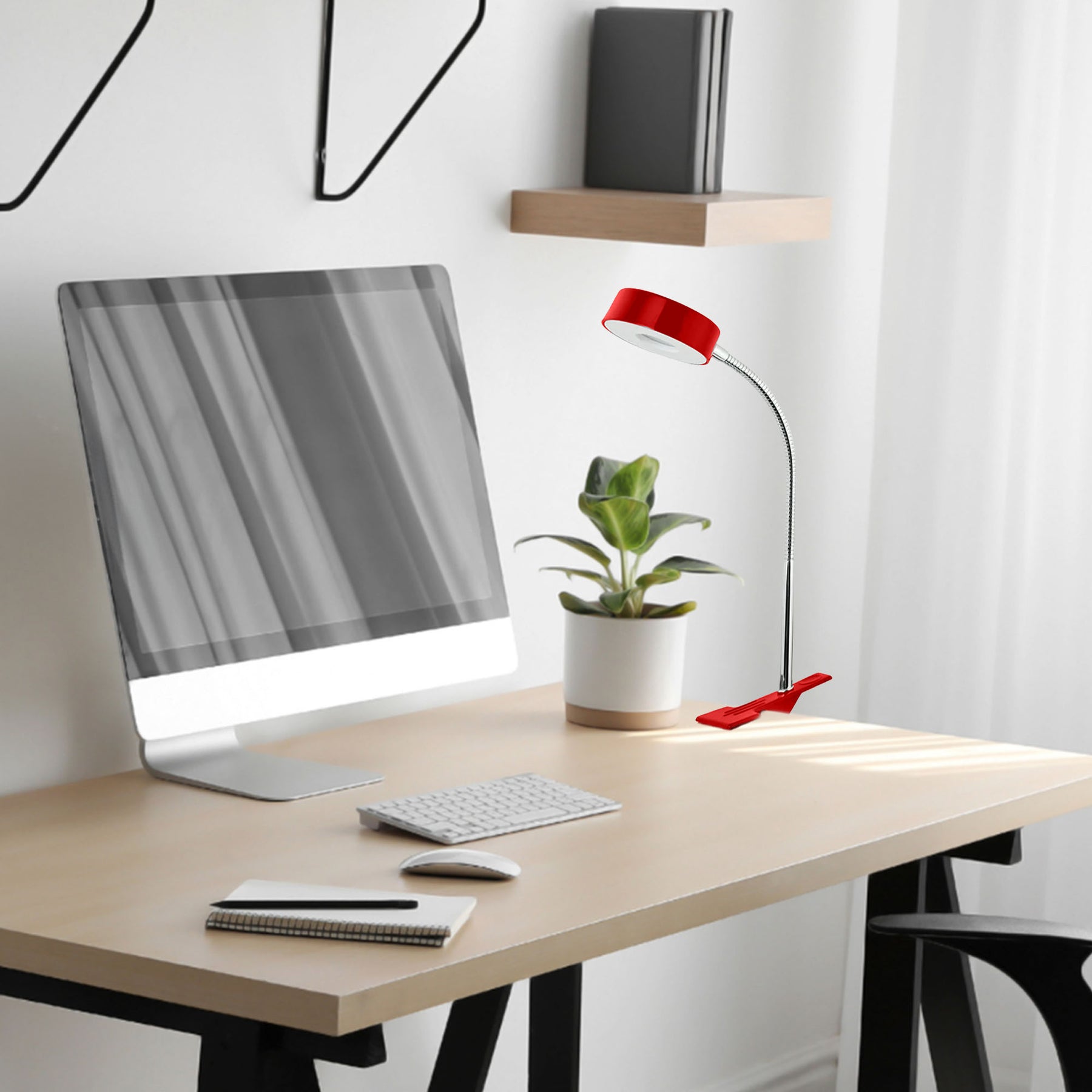 • Adorned in a captivating glossy red finish and featuring a stylish chrome gooseneck, this lamp adds a touch of modern flair to any workspace
