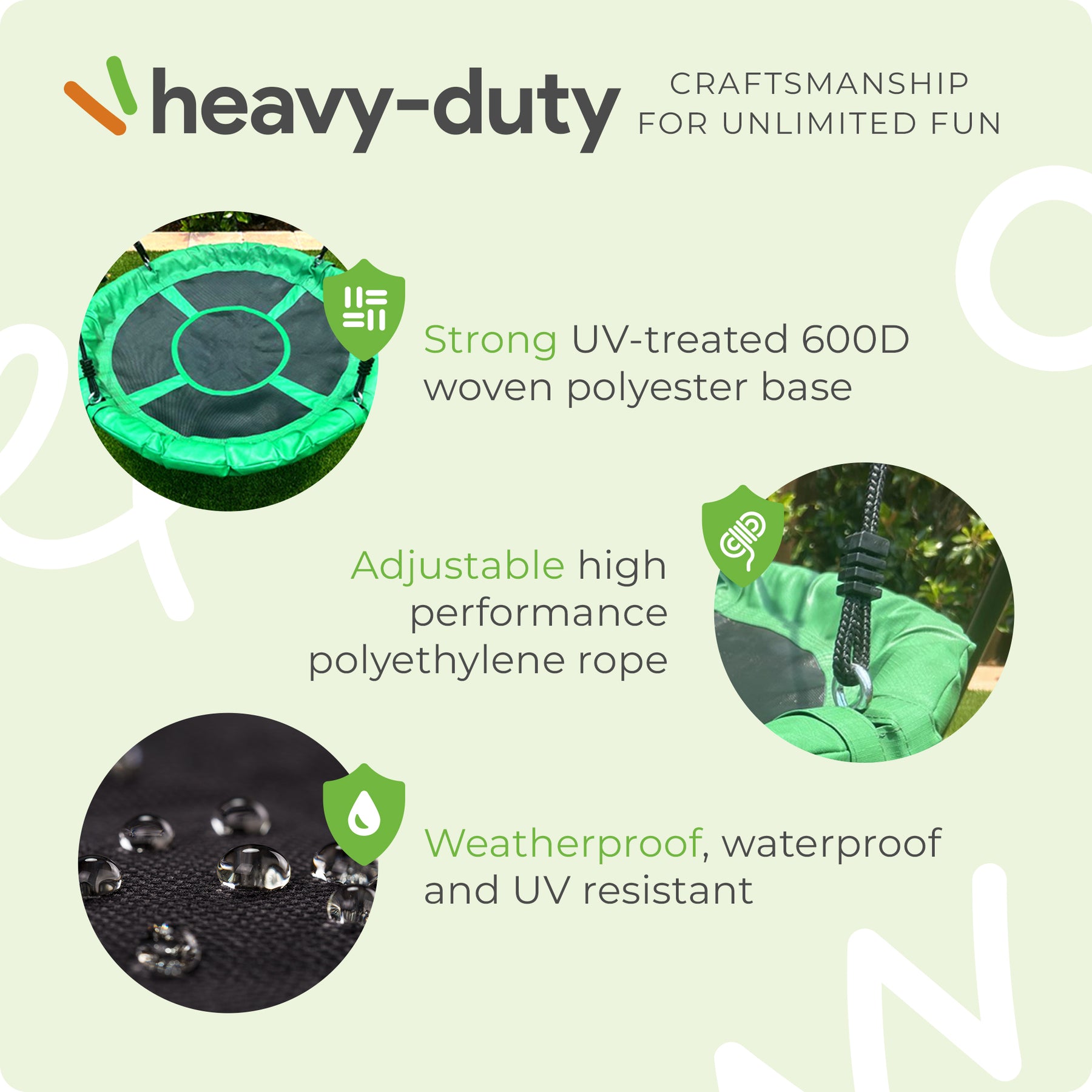 • Durable 600D polyester and waterproof design ensure the swing withstands outdoor elements