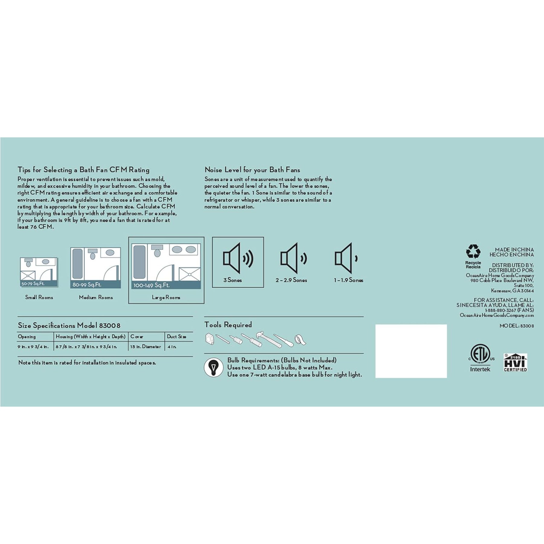 • Delivers 110 CFM airflow to efficiently remove excess humidity in large bathrooms, operating at 3.0 sones for quiet performance comparable to normal conversation