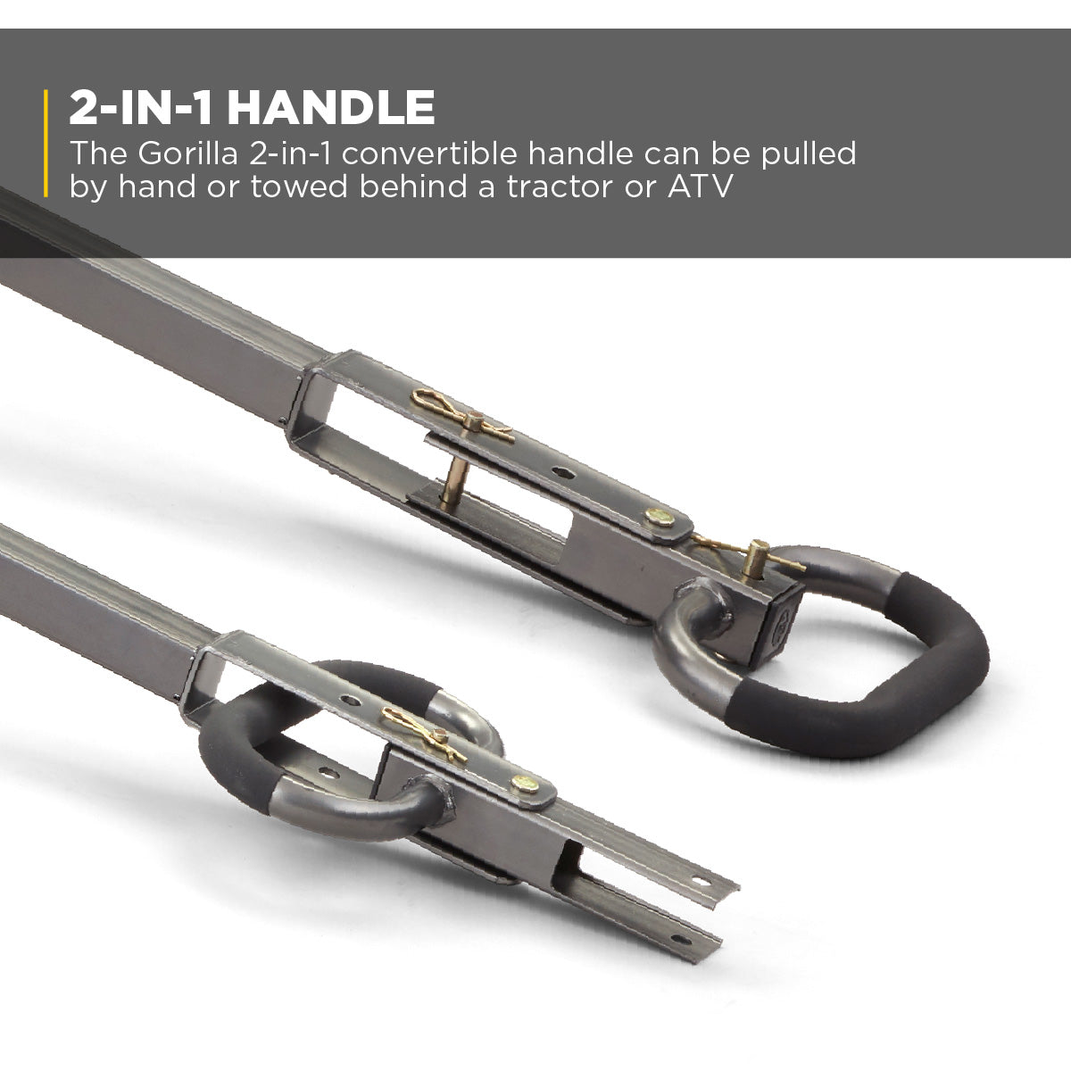 - 2-in-1 handle that you can easily pull by hand or hook up to an ATV or lawn tractor for heavier loads