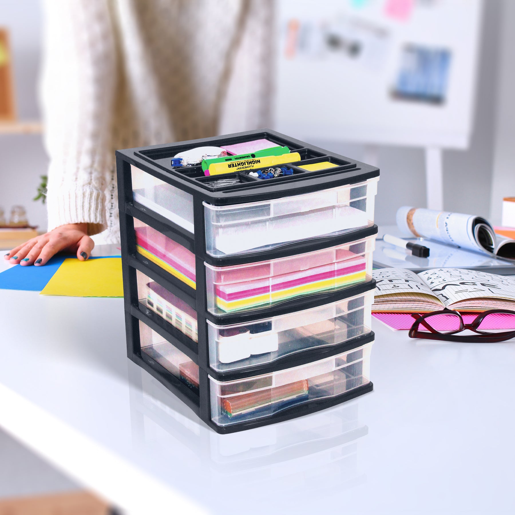 This desktop storage solution features 4 smooth-gliding drawers with handles for easy access to your items inside and a clear design for easily viewing and finding your items. With 4 drawers, you can use this plastic drawer unit as a makeup organizer, nail polish organizer, for small kitchen accessories, or for storing office desk accessories like pens and paperclips. The storage possibilities are endless! The handy 8.5 by 11-inch drawer provides convenience for your standard paper-sized supplies. Plus, the organizer lid keeps smaller items neatly in place helping to keep your desk clear of scattered items